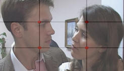 В настоящий момент мы говорим о кадре именно как об изображении, видимом на экране. Цель этой части статьи - научиться делать правильные и выразительные кадры, чтобы в любой момент вашей видеосъемки зритель видел картинку, не вызывающую внутреннего дискомфорта из-за того, что она неправильно показана. Законы кадрирования - правильного построения кадра - были открыты задолго до появления фотографии и кинематографа. Первооткрывателями этих законов выступили архитекторы и живописцы первых известных человечеству цивилизаций. Законам правильного кадрирования чужды веяния моды, всевозможных новых взглядов на искусство и так далее. Законы правильного кадрирования - это законы психологии человеческого восприятия, заложенные в нас природой, поэтому не стоит искать повод для инноваций там, где его нет и быть не может. Центр экрана, который нельзя трогать, но с которым нужно считаться Посмотрим на экран. Видеокамеры обычно предлагают пользователю выбор из двух вариантов - снимать в формате с соотношением сторон 4:3 (такой материал подходит для демонстрации на телевидении) или 16:9 (удобен для просмотра на современных плазменных панелях и т.д.). Что невольно привлекает внимание в любом кадре? Можете не пытаться удивить кого-либо оригинальным ответом, психологи давно решили этот вопрос. Правильно устроенной человеческой психике в кадре всегда будет интересен его центр. Значит ли это, что все интересные объекты в кадре надо располагать по центру? Ответ будет необычный. Нет, главные объекты в кадре нельзя располагать по центру! Они будут слишком явно давить на наше восприятие, создавать дискомфорт. Однако, направление движения в кадре, направление взгляда (главных объектов съемки) должно проходить от края к центру. О понятии "всегда", "нельзя" и прочих догматических утверждениях в этой статье В искусстве нет ничего запретного или невозможного. Поэтому относиться к словам "всегда", "никогда", "только" - следует критически. Обычно их следует читать как "для того, чтобы добиться должного эффекта"... (далее то самое категоричное "нельзя, "всегда" и т.д.). Поэтому отступим от повествования в категоричной форме, и заметим, что нарушение правил тоже создает у зрителя ощущение. Как отмечено выше, расположение по центру экрана объекта создает дискомфорт. Правильно воспользовавшись нарушением правил, мы можем создать нужную нам атмосферу происходящего на экране. Хотите дать зрителю почувствовать себя под суровым взглядом следователя? Расположите лицо следователя прямо по центру экрана, чтобы он смотрел зрителю прямо в переносицу. Не злоупотребляйте этим приемом, но имейте его в своем арсенале. Итак, расположение объекта прямо по центру кадра дает дискомфорт. Несмотря на достаточно нейтральное, даже несколько дружелюбное выражение лица, вы должны почувствовать некоторый дискомфорт. Атавизм, заложенный в нас природой: прямой взгляд есть выражение угрозы. Не будем разбираться в природе этого феномена, достаточно просто понаблюдать за стаей собак, обезьян, или казарменных "дедов", чтобы понять - явление существует, и мы должны учитывать этот эффект в своих работах. Теперь поэкспериментируем с линией взгляда, не давая ей пересечь центр экрана.