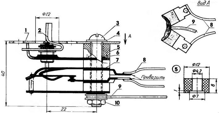 Òåðìîðåãóëÿòîð óòþãà â êîðïóñå ýëåêòðîïëèòêè (íàæìèòå äëÿ óâåëè÷åíèÿ): 1 - êîðïóñ ïëèòêè, 2 - ýëåìåíò ðåãóëèðîâî÷íûé ôàñîííûé, 3 - âèíò Ì4, 4 - øàéáà (3 øò.), 5 - âòóëêà êðåïåæíàÿ (ñ âûåìêîé ïîä ðàçâàëüöîâàííóþ âòóëêó-îáæèìêó), 6 - âòóëêà-îáæèìêà, 7 - òåðìîðåãóëÿòîð, 8 - æèëà ïðîâîäà òîêîíåñóùàÿ ìåäíàÿ (2 øò.), 9 - ïðîâîä "ìàññû", 10 - ãàéêà Ì4.