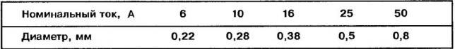 Таблица для выбора диаметра провода плавкой вставки