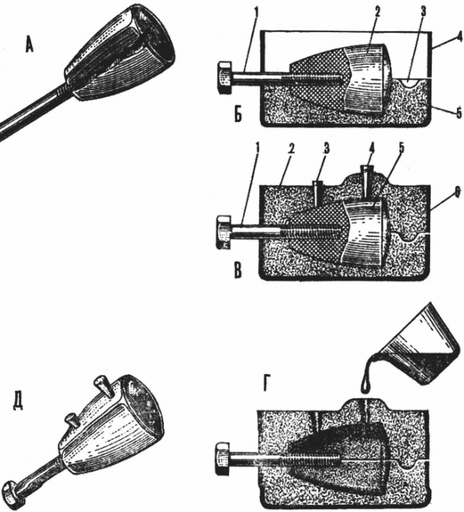 Рис. 1. Изготовление из эпоксидной смолы рукоятки переключения передачи: А - треснувшая рукоятка; Б - изготовление нижней полуформы: 1 - болт, 2 - рукоятка-эталон, 3 - лунка-фиксатор, 4 - коробка, 5 - гипс; В - изготовление верхней полуформы: 1 - болт, 2 - гипс, 3 - вставка под выпор, 4 - вставка под литник, 5 - рукоятка-эталон, 6 - коробка; Г - заливка эпоксидной смолы в форму; Д - готовая "отливка"