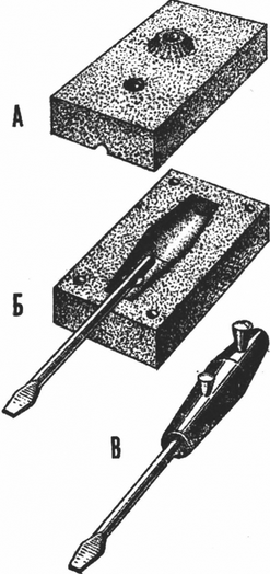 Рис. 2. Изготовление рукоятки для отвертки: А и Б - верхняя и нижняя полуформы; В - отвертка с готовой рукояткой