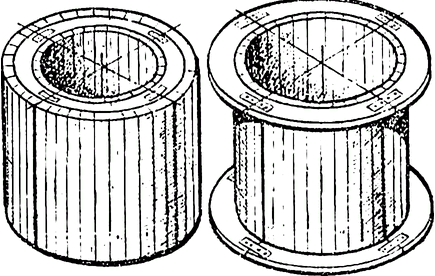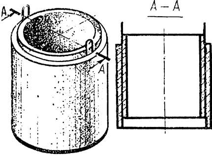 Форма делается разъемной и составляется из трех-четырех частей или кусков. Сперва необходимо сколотить деревянные кольца: два для сборки наружного цилиндра и два - для внутреннего. При этом сплошную деревянную форму делать совсем не обязательно: доски можно прибивать с зазорами, а затем обшивать кровельным листом, пластмассой, плотным картоном, водостойкой или обычной фанерой. Картон и фанеру рекомендуется окрасить масляной краской и хорошо просушить. Чтобы формы легче снимались с изделия, их покрывают топким слоем смазки или белят. После смазки стенок, обращенных друг к другу, части наружного цилиндра устанавливают на деревянный щит и прочно скрепляют планками на гвоздях. В наружный цилиндр строго по центру вставляют внутренний. В пространство между цилиндрами, точно соблюдая одинаковый зазор между стенками, вводят арматурный каркас, если изделие железобетонное, или ушки из арматурной проволоки (в бетонное). Между каркасом и цилиндрами размещают четыре клина - их задача удерживать арматуру в заданном положении. После этого заготавливают водный раствор цемента, песка и гравия. На 1 объемную часть цемента (марки не ниже 400) берут 2-3 объемные части песка и 4-5 частей мелкого гравия (или щебня). Сперва цемент рекомендуется перемешать с песком, а затем с гравием или щебнем. Чем однороднее приготовлена смесь, тем прочнее получится бетонная масса. Перемешивание - гарцовку - необходимо выполнять на бойке, то есть на деревянном щите. После гарцовки смесь смачивают водой, вновь тщательно перемешивают и по мере необходимости добавляют воду, чтобы бетонная масса приняла вид густого теста. Полученный раствор укладывают в пространство между цилиндрами слоями не более 100 мм и тщательно уплотняют стальным штырем Ø 10-15 мм. После укладки слоя клинья поднимают на 150-200 мм. Это необходимо для того, чтобы то место, которое они занимали, также было заполнено бетоном и уплотнено. Таким способом, называемым отбивкой, постепенно заливают всю форму. Применяют для тех же целей и раствор сметанообразной густоты, его также уплотняют. Этот процесс называется отливкой. Надо помнить, что чем гуще бетонная масса, тем она быстрее твердеет. Полученные отбивкой изделия можно освобождать из формы через 3-4 дня; отлитые - через 6-7 дней. В последних обычно бывает раковин меньше, чем в отбитых. Раковины обязательно замазывают цементным раствором. После снятия формы заготовку выдерживают на щите 3-5 дней, смачивая водой по три-четыре раза в день. Благодаря такой обработке бетон приобретает повышенную прочность. Если формы были смазаны машинным маслом или тавотом, то смазку необходимо тщательно удалить со всей поверхности заготовки. Предпочтительнее изготовлять кольца с замком. Но для этого необходимы два дополнительных деревянных кольца - для образования шейки и выступа. Кольца, выполненные таким образом, не смещаются. Швы между ними промазывают цементным раствором: 1 часть цемента и 2-3 части песка. И еще несколько попутных советов. Одно из колец, нижнее, надо сделать с уширением внизу: устроить снаружи второе кольцо высотой 150-200 мм с ножом из листовой или другой стали. Нож изготовляют отдельно и сочленяют со штырями, которыми он замоноличивается в бетон при отбивке или отливке заготовки. Конечно, можно выполнить этот элемент и без стального ножа, оставив его бетонным,