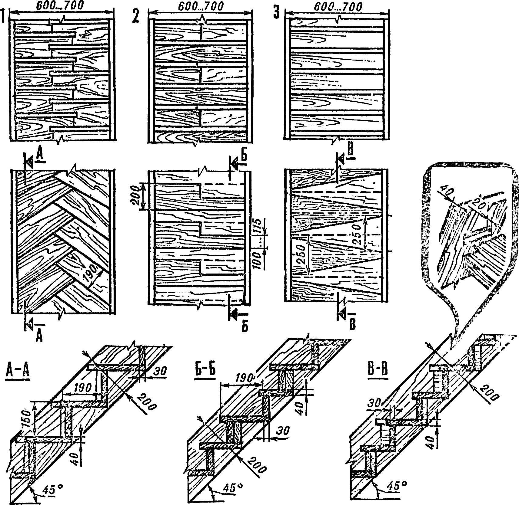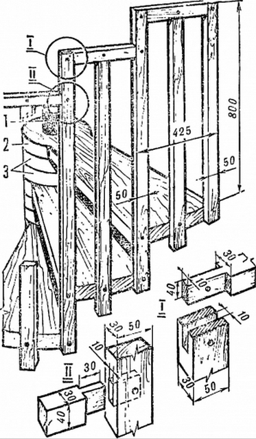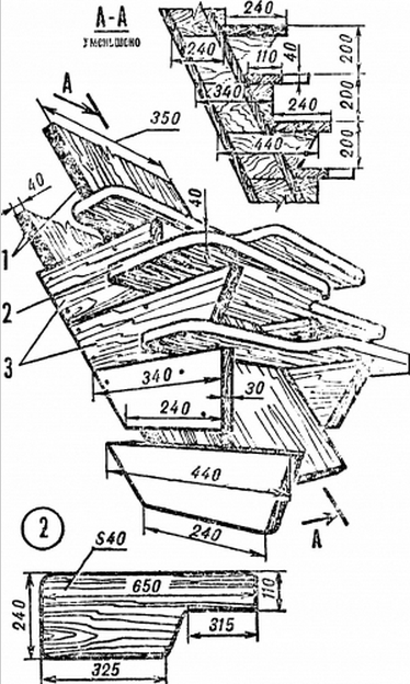 Учитывая поочередность шагания по ступеням, можно уменьшить длину их опорных площадок или расположить их под углом 120° (рис. 1) - во всех случаях толщина доски для ступени равна 40 мм, а подступенника - 30 мм. Каждая ступень или подступенник опирается или врезается в косоуры - расположенные параллельно брусы, упирающиеся в пол первого этажа и балку перекрытия второго.