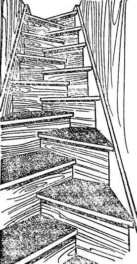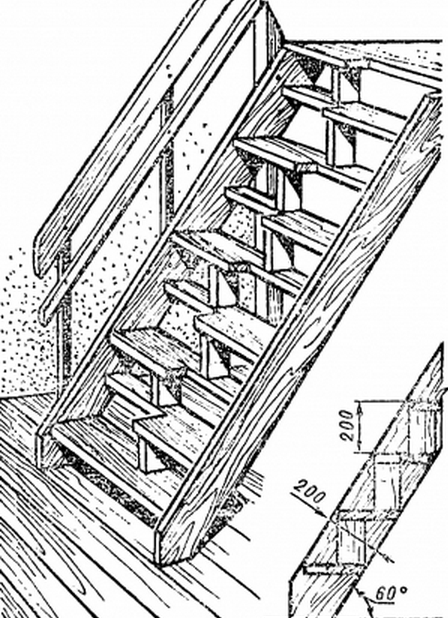 В чем ее особенность? Она отличается от других тем, что каждая ступень выполнена из доски с вырезом: сначала заготовка делится пополам в продольном и поперечном направлениях, а затем из нее вырезают часть. Все ступени крепятся к косоурам так, чтобы вырез первой из них был справа, а у следующей - слева, потом опять справа и т. д. Благодаря такому размещению подъем и спуск упрощается, поскольку опирающейся ноге благодаря вырезу не мешает расположенная выше ступенька, что особенно чувствуется при крутой лестнице. Очень важно подобрать подходящую окраску лестницы, согласуя ее с интерьером. Хороший эффект дает прозрачный мебельный лак; годится и масляная краска в сочетаниях светлых и темных тонов (желтый и коричневый, черный и светло-серый и т. д.). Автор: В.Страшнов