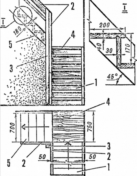 Внешне кажущаяся сложной форма лестницы на самом деле создается из простых элементов: одинаковых пластин ступеней и проставок между ними в виде деревянных дисков или цилиндров, общая высота которых 100 мм. В рассматриваемом варианте все эти элементы нанизываются на металлическую трубу, жестко закрепленную в полу (низ) и в потолке (верх). Толщина доски для ступеньки равна 50 мм, длина 1000 мм; ширина в районе опоры - 280 мм, с краю у перил - 425 мм. В более высоком помещении лестница может быть двухмаршевой или полуторамаршевой (рис. 5), что позволяет сохранить угол наклона 45°. Конструкция марша и здесь состоит из двух параллельных косоуров, на которые устанавливаются ступени и подступенники. Балки промежуточной площадки крепятся к стенам и деревянной стойке, одновременно фиксирующей косоур лестницы. К этой же стойке прикрепляются и перила ограждения высотой 800 мм. Размеры промежуточной площадки по ширине и длине одинаковы (750х750 мм): ведь она стыкуется с одинаковыми по ширине участками лестницы.