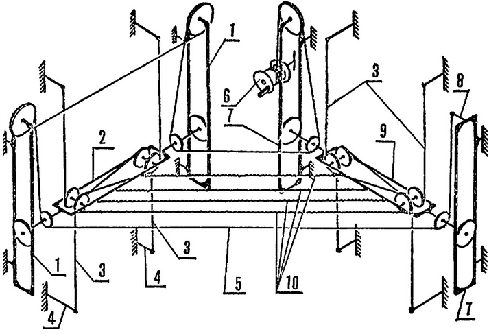 Ðèñ. 1. Ïðèíöèïèàëüíàÿ ñõåìà ïðîâîäêè øíóðîâ ïîäúåìà è ïðîòèâîïåðåêîñíîé ñèñòåìû (íàæìèòå äëÿ óâåëè÷åíèÿ): 1 - íàïðàâëÿþùèå ëåâîé ÷àñòè áåëüåâîãî "ëèôòà", 2 - ëåâàÿ ïîïåðå÷èíà, 3 - øíóðû ïðîòèâîïåðåêîñíîé ñèñòåìû, 4 - çàäåëêà øíóðîâ, 5 - øíóð ïîäúåìà, 6 - êàòóøêà ïîäúåìà, 7 - íàïðàâëÿþùèå ïðàâîé ÷àñòè áåëüåâîãî "ëèôòà", 8 - çàäåëêà øíóðà ïîäúåìà, 9 - ïðàâàÿ ïîïåðå÷èíà, 10 - áåëüåâûå âåðåâêè
