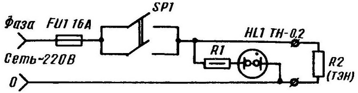 Принцип действия бойлера довольно прост. Холодная вода из водопроводного крана через резиновую трубку поступает на датчик давления; резиновая диафрагма его становится выпуклой и давит вверх на коромысло. Последнее противоположным концом нажимает на подвижной механизм переключателя, который подключает нагревательный элемент (далее ТЭН) к сети. При этом загорается индикаторная лампочка, сигнализирующая о том, что ТЭН под напряжением. Вода, пройдя через датчик давления, попадает в нагреватель, а затем - к месту ее использования. В конструкции бойлера применен водонагревательный ТЭН довольно большой мощности - 3 кВт. При этом ток, потребляемый нагревателем, составляет около 15 А. Следовательно, коммутирующее устройство должно выдерживать нагрузку не менее 15 А и быть по возможности быстродействующим. Фаза обязательно должна подаваться на коммутирующий элемент, а "О" соединяться постоянно. В данной конструкции применены два микропереключателя на 16 А и 380 В. (Принципиальная электрическая схема бойлера изображена на рис. 2.)