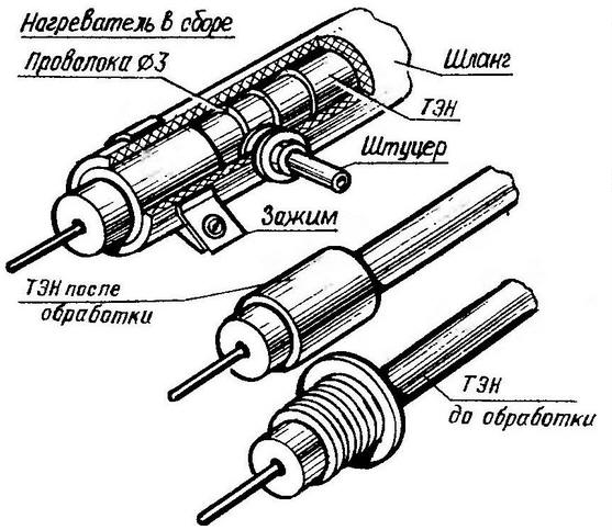 Детали и конструкция Для изготовления водонагревателя необходимы: 1. Водонагревательный элемент (ТЭН 3-220). 2. Проволока диаметр 3 мм и длиной 10 м. 3. Шланг резиновый внутренним диаметр 22 мм и длиной 1300 мм. 4. Трубка резиновая внутренним диаметр 8 мм и длиной 1000 мм. 5. Два штуцера. 6. Две шайбы диаметр 12x20 мм. 7. Две гайки М 12x1,25. 8. Два хомута из жести толщиной 0,5 мм. 9. Датчик давления в сборе. Подготовка деталей к сборке осуществляется следующим образом. Водонагревательный элемент необходимо разогнуть на угол 50 - 60°. Сточить напильником фланцы и резьбу на головках (рис. 3). Плотно обмотать проволокой нагревающую часть ТЭНа по всей длине с шагом в 10 мм. Теперь на ТЭН с обмоткой предстоит надвинуть шланг, на котором, отступив от края приблизительно на 50 мм, предварительно необходимо проделать отверстие под штуцер. Вставив последний, закрепить его гайкой, подложив под нее шайбу. Далее следует свободный конец шланга натянуть на обмотанный проволокой ТЭН (для облегчения работы проволоку можно смазать солидолом) и сравнять края шайбы штуцера с краем обточенной головки ТЭНа. На противоположном конце шланга наметить отверстие для второго штуцера. Сдернув шланг, сделать отверстие, вставить в него штуцер и закрепить гайкой с шайбой. Установить шланг на место, обрезать концы по краям ТЭНа и плотно затянуть их хомутами. Согнуть ТЭН в исходное положение. (На рис. 3 изображен один из концов смонтированного водонагревателя.) Основание, крышка, кронштейн коромысла, само коромысло и зажимы выполняются из оцинкованной жести толщиной 0,5 мм. Все детали крепятся на основании. Вырезать их нужно строго по размерам, затем просверлить отверстия и согнуть по линиям сгиба.