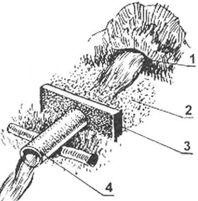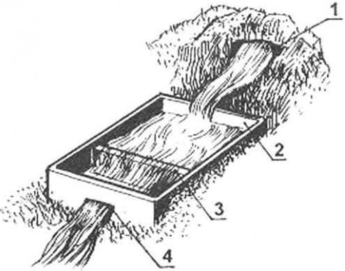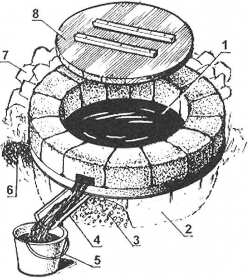 Вокруг колодца устраивают отмостку, благодаря которой дождевая вода сливается в сторону, минуя колодец. Отмостка должна быть покрыта цементными плитами, кирпичом, камнем-плитняком, бетоном или асфальтом. Желательно устроить также вокруг источника ограду, расположив ее на расстоянии не менее 3 - 4 метров от резервуара. Ограждение предохраняет колодец от приближения к ному животных. Сливаемая из колодца вода должна отводиться как можно дальше. Для этого роют специальную канавку такой глубины, чтобы вода не растекалась в стороны и не насыщала грунт. Дно и стенки канавки рекомендуется выложить слоем мятой жирной глины, которая препятствует прониканию сливаемой воды в грунт. Чтобы глина не размывалась водой, ее надо обложить камнем-плитняком. Нисходящие ключевые колодцы Они устраиваются там, где родник слабый, "без напора". Резервуар для него - небольшой, "накопительный". Он может быть из любых материалов, но обязательно с деревянным, бетонным, кирпичным или каменным дном Поскольку вода ключа несет с собой частицы ила, грунта или других нежелательных примесей, то резервуар следует разделить на две части. Перегородку можно сделать из любых материалов и поставить поперек потока воды. Таким образом получается два отделения: вода поступает в первое, отстаивается здесь и в чистом виде переливается через верх перегородки во второе, из которого через сливное отверстие уходит из резервуара и отводится по сливной канавке как можно дальше от колодца. Если ключ совсем слабый, можно обойтись и без резервуара, оформив водоносный путь и сам выход воды любым материалом. Например, пустив ручей по трубе. Но и в этом случае будет гораздо лучше, если поперек потока воды устроить перегородку из любого материала со вставленной в нее трубой подходящего диаметра. Если ее пропускной способности недостаточно, можно поставить рядом сразу несколько. Перед входом в трубу поток воды должен проходить достаточно толстый слой (20 - 30 см) гравия или щебня, чтобы очищаться от всевозможных посторонних примесей и попадать в раздаточную трубу совершенно чистым. Такую воду можно сразу набирать в любую посуду из сливной трубы.