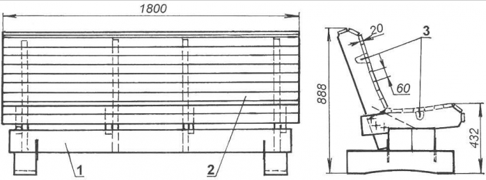 Рис. 1. Ортопедический эргономический деревянный садовый диван (нажмите для увеличения): 1 - остов; 2 - обшивка (деревянные планки 20x60, по потребности); 3 - шурупы (по потребности)