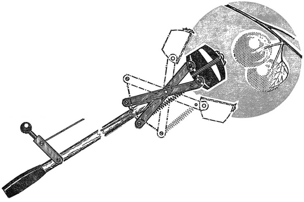 Èñõîäíîå ïîëîæåíèå ÷àøåê çàõâàòà - îòêðûòîå, îíî îáåñïå÷èâàåòñÿ ñïèðàëüíîé ïðóæèíîé. Òîëêíèòå ðû÷àã âïåðåä - ÷àøêè îòêðîþòñÿ, òåïåðü çàõâàò ìîæíî ïîäíåñòè ê ÿáëîêó è, ïîòÿíóâ ðû÷àã ê ñåáå, àêêóðàòíî ñðåçàòü ïëîä.