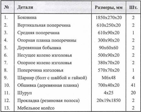 Поперечины рамы дощатые; с боковинами они соединяются с помощью бобышек (передняя и задняя) и планок (средняя). В головной части рамы по вертикальным торцам боковин выполняется обшивка из таких же планок, что и основной лежак. Она играет не только декоративную роль, но и служит опорой для регулировки наклона изголовья.