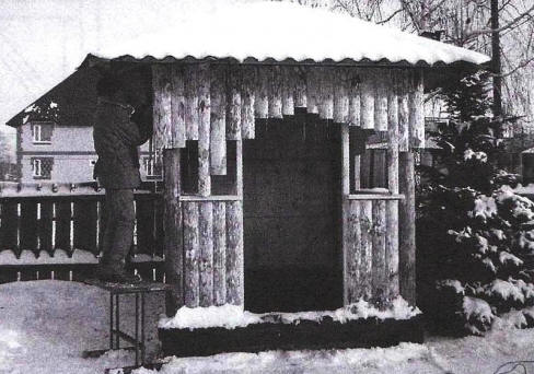 Для более плотного и надежного соединения бревенчатых элементов в местах их стыков делал разные небольшие вырубки. На стропила уложил разреженную обрешетку из необрезных досок. В завершение этапа строительства беседки напилил из обломанных шиферных листов подходящие куски и покрыл ими крышу. Спустя какое-то время купил "на дрова" машину горбыля и выбрал из него наиболее ровные доски. После очистки от коры, выравнивания кромок и чистового обстругивания с внутренней стороны получился отличный и даже стильный обшивочный материал! Но сразу прибивать уже подготовленные планки не стал, а уложил в штабель на просушку. Уже поздней осенью, по заморозкам, мы с сыном "пришурупили" обшивку. Электролобзиком выпилили арки над открытыми проемами, которые придали беседке прямо-таки какую-то классичность. Лишь перила и входные косяки выполнил из сортовой доски-пятидесятки, распиленной на брус. Поскольку большая часть горбыля, предназначенного на дрова, была использована для обшивки беседки, то пришлось докупить еще. Правда, на этот раз горбыль оказался не "дощатым", а скорее "брусовым" (более одномерным в сечении). Но тут же, прокрутив в голове варианты, решил, что из него можно будет изготовить пол в беседке. Зимой же из вновь приобретенного горбыля выбрали наиболее подходящий брус. Сложенный аккуратно в штабель, он просыхал до середины лета, после чего приступили к изготовлению из него пола. Пол же для удобства решил делать составным из трех щитов.