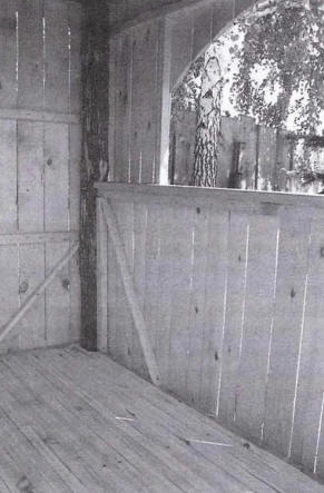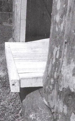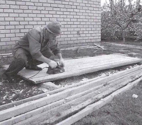 Для набора щитов пола из "брусового" горбыля на ровной полянке возле дома соорудил простейший стапель: положил параллельно одна другой пару досок. На них ровной (распиленной) поверхностью уложил два первых бруска и сколотил их в торцах гвоздями. Таким же образом приколотил третий брус, четвертый, пятый ... Набрав нужную ширину, топором подровнял до одного уровня места, которые должны будут лечь на бревна обвязки и среднюю балку-лаг беседки до толщины 50 мм. Получившийся щит перевернули "лицом к солнышку" и острогали начисто ручным электрорубанком. После этого первый готовый щит отвезли на тележке к беседке и уложили на место. Таким же образом набрали и сплотили еще два щита. Средний щит имеет ширину входного проема и немного длиннее боковых - на величину выступа-порога, но чтобы он не выходил за пределы проекции свеса переднего края кровли. После пришивки щитов на место гвоздями наступила завершающая операция: тонированная пропитка стен и покраска в коричневый цвет наборного пола. Хочется отметить, что хотя пол тоже был изготовлен из отходов, но выглядит он как палубный паркет.