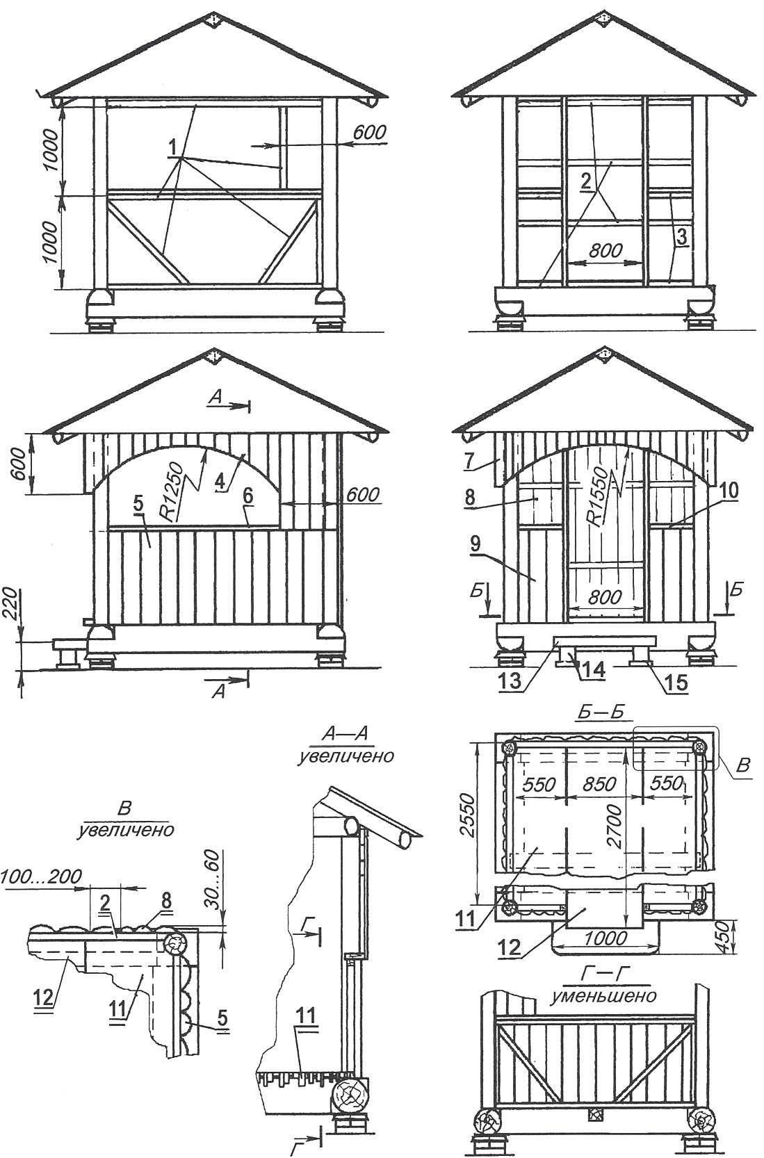 Беседка из горбыля. Советы домашнему мастеру Справочник / Строителю, домашнему мастеру В тихом уголке сада своего усадебного дома посадил пихточку. Прошло три года. Деревце окрепло, подросло. И тогда возникла идея построить рядом небольшую беседку, которую со временем пихта в жаркий летний день прикроет тенью своих ветвей. На досуге даже набросал эскиз строения. Но, как это часто бывает, воплощение идеи тормозилось отсутствием материалов, а точнее - выделением из семейного бюджета средств на их приобретение, поскольку это дело не являлось столь уж насущным. Но и от задумки отказываться не хотелось. Стал размышлять над тем, как осуществить строительство, чтобы было не дорого, но вместе с тем красиво: ведь беседка - постройка скорее для души, и нахождение в ней должно доставлять удовольствие. Собрал весь подходящий материал, имевшийся в наличии: несколько сосновых бревен, брус, доски, шифер. Сначала из четырех самых толстых бревен (их диаметр около 300 мм) срубил обвязку, но скреплять ее детали пока не стал. Возле пихты, в намеченном для сооружения беседки месте, по углам обвязки разметил и выкопал ямы размерами 300x300 мм и глубиной до плотной глины (около 600 мм). Ямы засыпал песком до поверхности земли при послойном уплотнении с поливкой водой ручной трамбовкой. На песчаные подушки уложил четыре кирпичных столбика (высота в два ряда), их верх выровнял раствором до одинакового уровня, покрыл рубероидом и подкладными досками, пропитанными антисептическим раствором. После этого собрал обвязку на столбиках, скрепив ее бревна скобами, изготовленными из стального арматурного стержня толщиной 10 мм. Бревна тоже обработал антисептиком. Далее по углам обвязки выставил вертикально по отвесу четыре угловые бревенчатые стойки, закрепив временно подкосами, а затем соединил их верхние концы потолочными балками, расположенными Х-образно (по диагонали). Из бревен потоньше соорудил стропила в виде пирамиды для шатровой крыши, подперев их короткой центральной стойкой, в свою очередь, оперши ее на перекрестие потолочных балок.