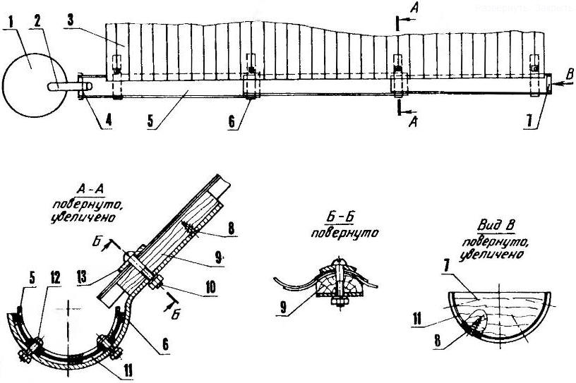 Óñòðîéñòâî âîäîñòîêà (âèä ñâåðõó) (íàæìèòå äëÿ óâåëè÷åíèÿ): 1 - áî÷êà; 2 - âîäîñëèâ (æåðäü d30, L3200); 3 - êðîâëÿ; 4 - îãðàíè÷èòåëü (ïðîâîëîêà àëþìèíèåâàÿ, d2); 5 - æåëîá (çàãîòîâêà - ïëàñòìàññîâàÿ òðóáà d100, L2000, 3 øò.); 6 - êðîíøòåéíû (ñòàëü, ïîëîñà 300x36x2, 4 øò.); 7 - çàãëóøêà (äðåâåñèíà); 8 - øóðóïû 4x16 (8 øò.); 9 ïðîêëàäêà (äðåâåñèíà, 4 øò.); 10 - áîëò Ì6õ48 (4 øò.); 11 - ïðîêëàäêè ãåðìåòèçèðóþùèå (ìÿãêàÿ ðåçèíà 140x15x2, 3 øò.); 12 - áîëò Ì4õ16 (8 øò.); 13 - øàéáà ôèãóðíàÿ (àëþìèíèåâûé ñïëàâ, ëèñò 20x20x3, 4 øò.).