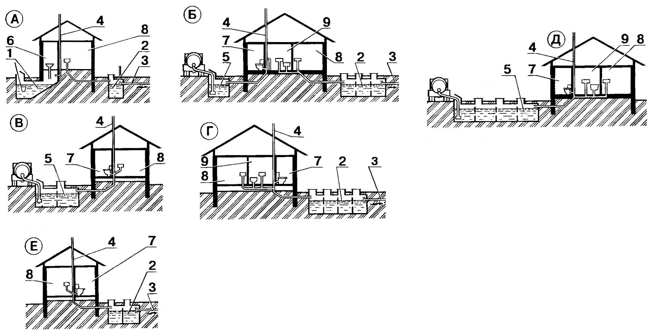 Цифрами обозначены: 1 - выгреб люфт-клозета, 2 - септик, 3 - выпуск на очистные сооружения, 4 - вентиляционный стояк, 5 - выгреб бытовых стоков, 6 - люфт-клозет, 7 - ватер-клозет, 8 - кухня с мойкой, 9 - ванная комната с ванной и умывальником.