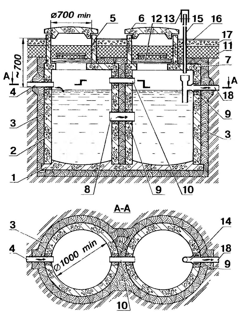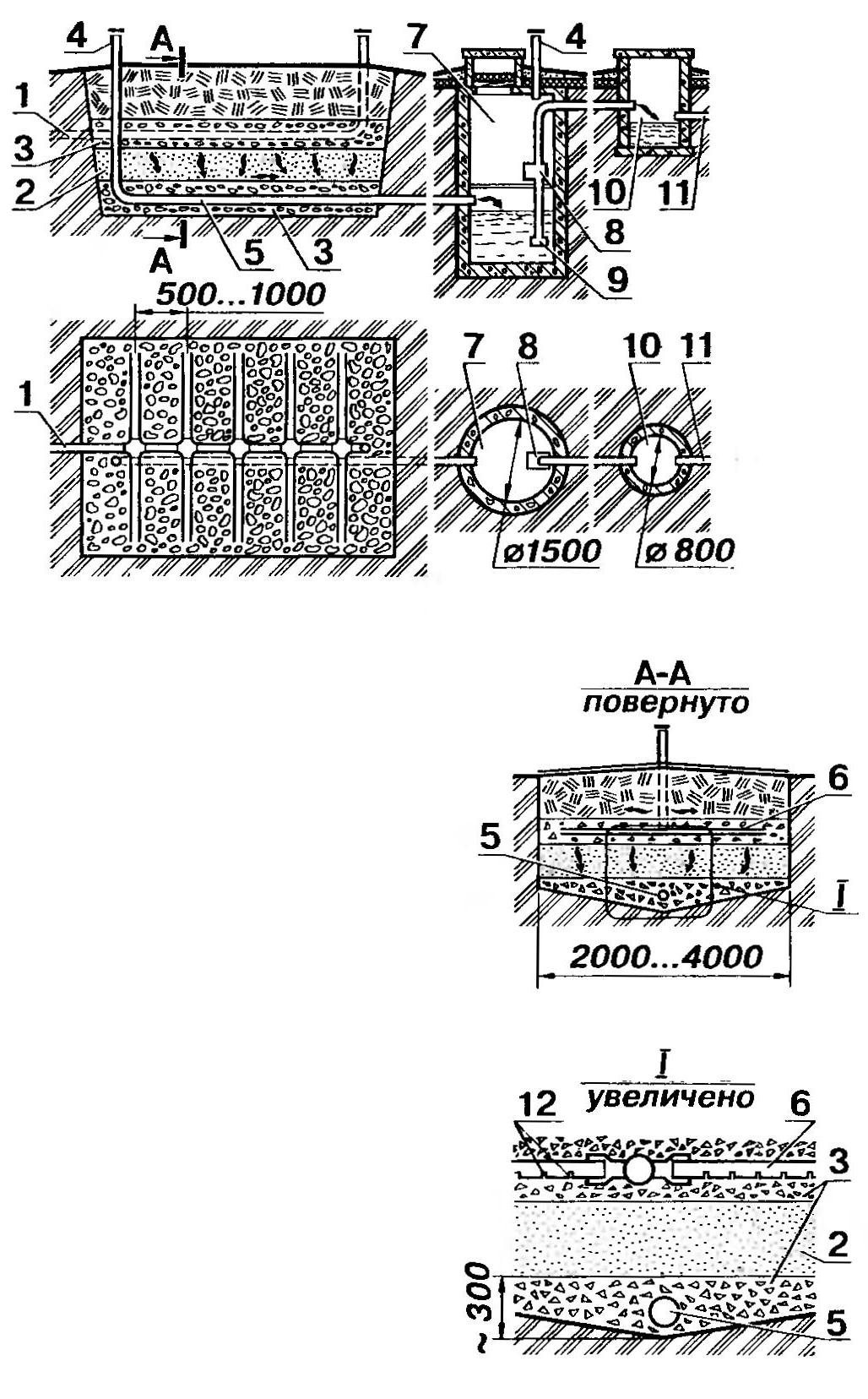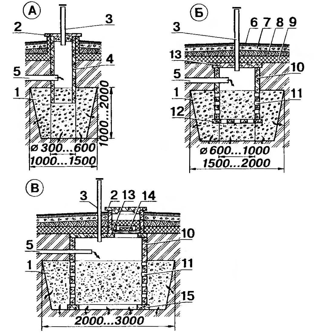 Цифрами обозначены: 1 - фильтрующий материал (битый кирпич, щебень, шлак или крупнозернистый песок), 2 - крышка люка (железобетон), 3 - вентиляционный стояк, 4 - стена колодца (асбоцементная или железобетонная труба), 5 - подводящий канал, 6 - отмостка, 7 - щебеночная засыпка, 8 - изоляция (глина), 9 - утеплитель, 10 - кольцо (железобетон), 11 - отверстие для пропуска фильтрата, 12 - дно (железобетон), 13 - перекрытие (железобетон), 14 - крышка люка (древесина), 15 - опорное кольцо (монолитный бетон).