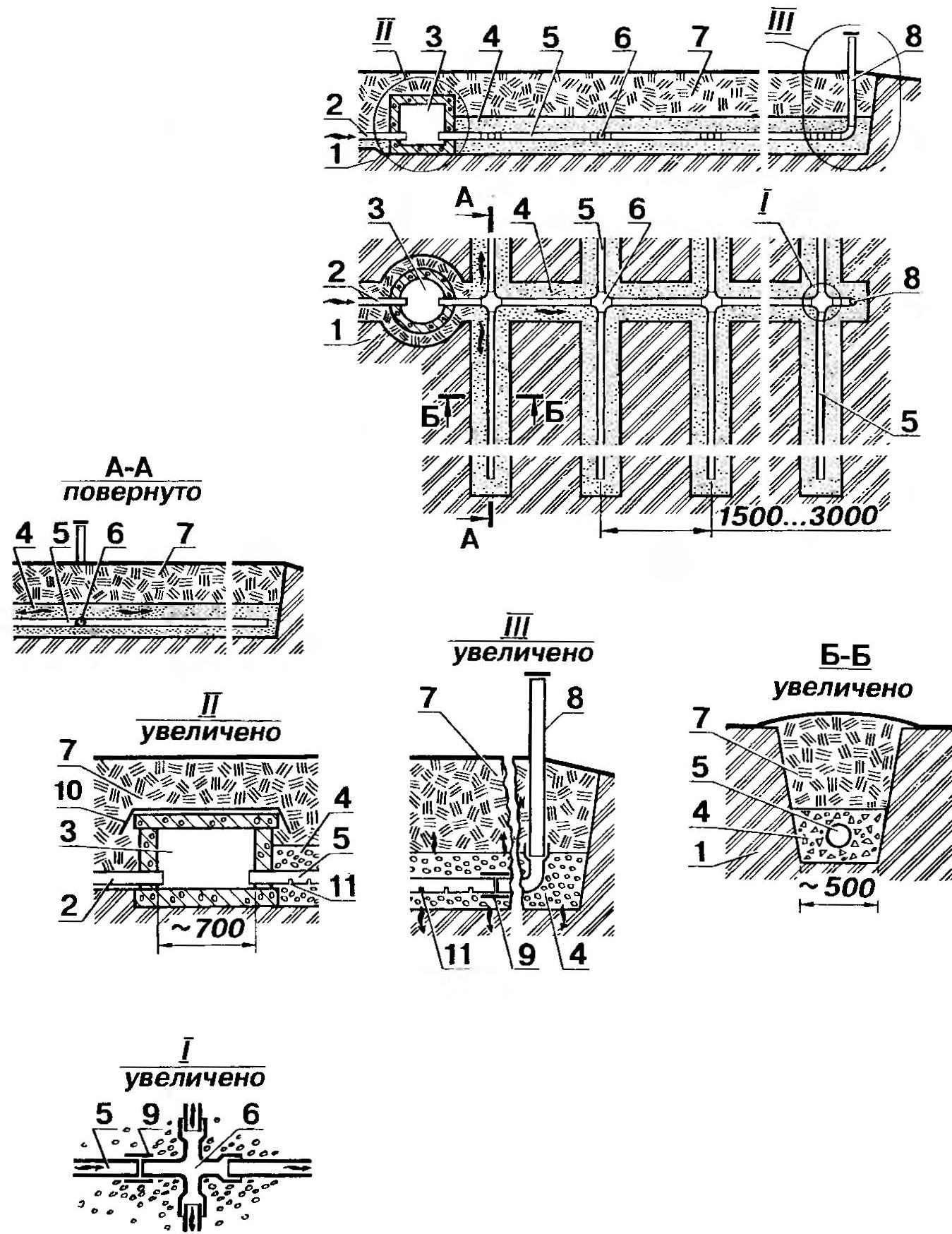 Загрязненность бытовых сточных вод определяется в основном наличием в них органических веществ, которые в процессе очистки должны быть минерализованы. Делается это обычно в два этапа: вначале сточные воды поступают в специальные отстойники (септики), где они расслаиваются и осветляются, а затем подвергаются дальнейшей обработке на сооружениях биологической очистки. Септик представляет собой герметичную емкость, через которую с малой скоростью (в течение четырех и более суток) проходят бытовые сточные воды. Взвешенные вещества выпадают в осадок, а осветленная вода направляется на последующую биологическую очистку. Органическая часть осадка за шесть - двенадцать месяцев под влиянием анаэробных микроорганизмов разрушается и превращается в газообразные и растворимые минеральные вещества. Для улучшения процесса очистки септик разделяют на несколько отдельных камер, соединенных между собой трубами. Размер септика выбирается с таким расчетом, чтобы внутренний его объем в 3...5 раз превышал среднесуточный объем сточных вод. Например, при стоке 200 л/сут. объем септика должен быть не менее 0,6 м3. Устроен септик приблизительно так же, как и выгреб: это герметичная емкость со смотровым люком, защищенная от промерзания, а также от дождевых и паводковых вод. Через люк периодически очищают поверхность сточных вод от корки из всплывающих иловых частиц и один-два раза в год очищают дно от илового осадка. Кстати, удалять весь ил не рекомендуется, около 20% этой массы следует оставлять на дне для размножения бактерий, способствующих распаду органических веществ. После прохождения септика осветленные сточные воды поступают на фильтрующие сооружения биологической очистки. Этот метод основан на использовании жизнедеятельности микроорганизмов, находящихся в фильтрующем материале. Они быстро окисляют органические вещества и превращают их в безвредные продукты распада. Поскольку жизнедеятельность аэробных бактерий связана с потреблением кислорода, сооружения биологической очистки должны обеспечивать наибольшую площадь контакта сточных вод с воздухом. Для удаления продуктов распада, вредных для жизни бактерий (например, углекислого газа), предусматривают эффективную вентиляцию. фильтрующего устройства выбирается в зависимости от характеристик грунта, влияющих на эффективность очистки сточных вод, объема стока и размеров приусадебного участка. Наиболее простое и дешевое очистное сооружение - фильтрующий колодец. Функционирует он за счет естественной способности пористых грунтов пропускать через себя воду и отводить ее за пределы насыщаемого участка. Пропускная способность такого устройства зависит от поглощающих свойств грунта, расположенного на глубине 1...3 м, и площади соприкосновения с ним сточных вод. Ну а степень биологической очистки - от количества и качества закладываемого в колодец вместо извлеченного грунта фильтрующего материала, на поверхности которого образуется заселенный микроорганизмами ил. Используя органические остатки в качестве питательных веществ, микроорганизмы минерализуют и очищают попадающие в колодец сточные воды. Потребную площадь фильтрующей поверхности несложно подсчитать, если знать, что водопоглощение 1 м2 песчаных грунтов составляет 60...100 л/сут. (супесчаных-30...50 л). Например, при объеме с