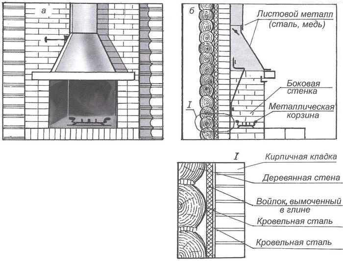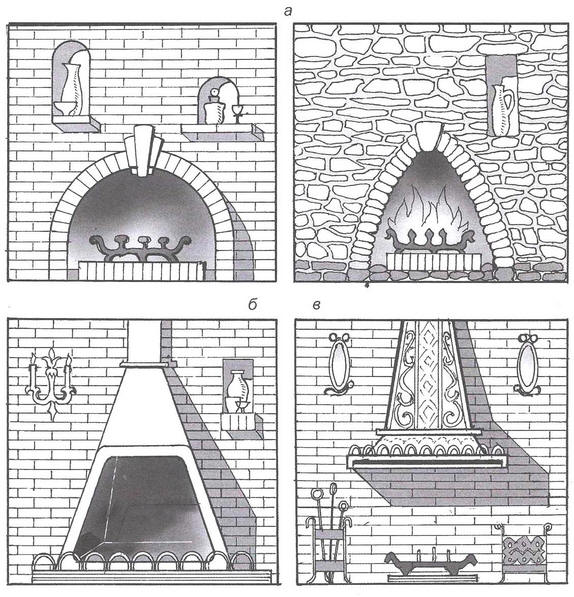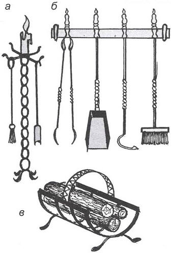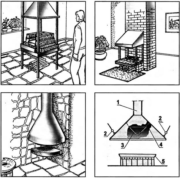 Изоляционная стенка может повторять форму камина и дымохода, выходя за них в ту и другую сторону на 250-300 мм. Поскольку вся эта конструкция (изоляционная стенка плюс камин) тяжелая, придется делать фундамент. Его выкладывают из камней или боя кирпича с щебнем на цементно-песчаном растворе. Ниже пола устраивают гидроизоляцию из двух слоев рубероида, а на отметке чистого пола делают цементно-песчаную стяжку. Если фундамент не обязателен, то под досками пола все равно следует заложить дополнительную балку. Возможно множество самых разных вариантов оформления каминов. В частности, камины пристроенного типа можно сложить из бутового камня; допустимы варианты с бетонными топливниками. На рисунках 1 и 3 показаны различные камины. Среди них выделяются те, что имеют портал в виде арки. Арки выкладывают одновременно с двух сторон по деревянному кружалу, которое поддерживает укладываемые кирпичи или камни. Его убирают, завершив кладку; вверху устанавливают один-три крупных камня - замок. Наиболее распространены варианты пристроенных каминов, основным материалом для изготовления которых является кирпич. Такой камин может иметь кирпично-бетонное основание, а в качестве дымосборника - подвесной колпак из листового металла. По краям короба-основания можно сделать подставки для шампуров. Открытые ("островные") камины Они предназначены для установки в отдалении от стен - например, посередине комнаты на круглой или квадратной в плане площадке, приподнятой над полом на 350 - 500 мм. Над ней подвешивают круглый или квадратный дымосборник и дымовую трубу из листового металла; они могут быть выложены из кирпича. "Островной" металлический камин можно сделать из железной трубы или бочки диаметром 800 - 1000 мм. Подставка такого камина - кирпичная или бетонная с заделанными анкерными болтами для крепления бочки. Консольная площадка под топливником - металлическая, по ней кладут асбест, выполняют цементную стяжку и отделывают поверхность керамической плиткой. Для внешнего оформления каминов можно использовать различные материалы - естественные камни всех видов, в том числе неправильной формы, малой, средней и большой величины и структуры поверхности, кирпич, изразцы, плитки, дерево, цветные и черные металлы, строительную керамику, штукатурку с различной техникой нанесения. Хорошим украшением служит кованый каминный инструмент, корзины для дров (рис.6), а также чеканка, медальоны, керамические изделия и др. Но не стоит перегружать камин различными украшениями, их должно быть в меру. Камин необходимо размещать посередине стены или так, чтобы по его сторонам оставались участки стен не менее одного метра. Камин нельзя ставить на проходе, а также в местах, где могут быть сквозняки, то есть между оконными или дверными проемами в противоположных или смежных стенах. В таких местах он будет дымить. Готовый кирпичный камин, так же как и печь, сначала сушат периодическими топками в течение нескольких часов. Перед тем как растопить камин, рекомендуется для образования первоначальной тяги сжечь в нем свернутую в жгут газету. Дрова укладывают горкой с опорой на заднюю стенку топливника. Для топки лучше всего использовать березовые, осиновые и ольховые дрова. Особенно хороши осиновые чурки - они дают ровное белое пламя, не "стреляют" и не коптят. Для аромата можно подбр