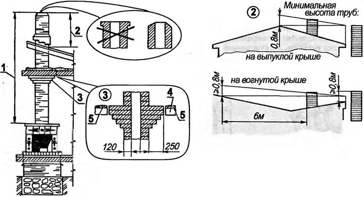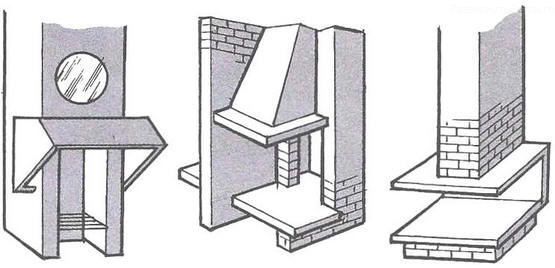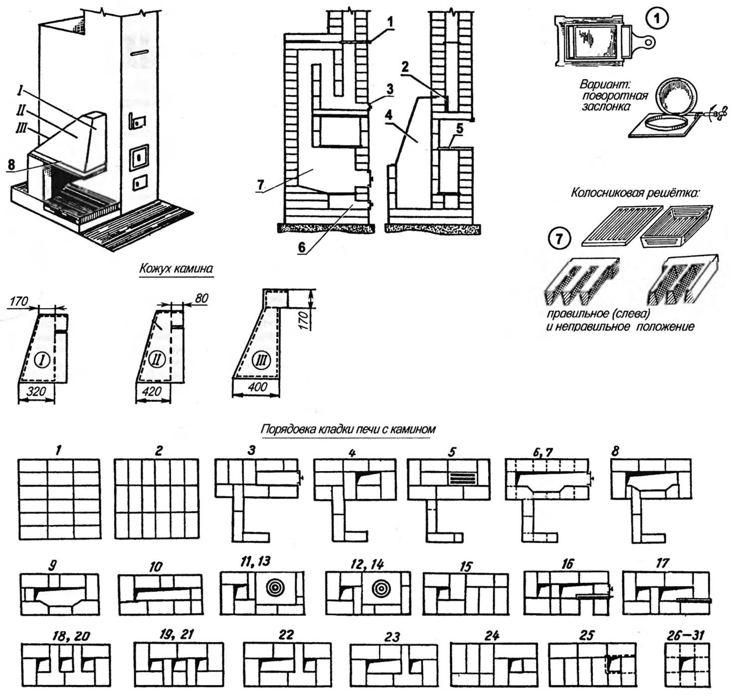 Важный элемент трубы - ее верхняя часть, оголовок. Для обеспечения тяги он должен быть простым (рис.), без завершающих карнизов или выступов Для пожарной безопасности на оголовок надевают металлический колпак с глухой крышей и проволочной мелкоячеистой сеткой (не более 5,5 мм). Высота дымовой трубы от колосниковой решетки до устья должна быть, по новым правилам, не менее 5 метров, а верхняя видимая часть ее возвышаться над кровлей или над коньком крыши как минимум на 0,5 м. Камин-печь Оптимален для небольшого помещения типа "садовый домик". Сама печь должна быть компактной и экономичной, а пристроенный к ней камин иметь площадь 0,5 м2 (750x750 мм). Для его кладки потребуется около 200 штук красного и 35 штук огнеупорного (или хорошо обожженного красного) кирпича. Камин-печь отличается простотой устройства. Основные его элементы - кирпичное основание и колпак-дымосборник из металлического листа. Чтобы обеспечить дровам оптимальное горение, на топочную площадку следует установить решетчатую подставку (колосник). Камин устанавливают на фундаменте из бутового камня и песчаной подушке. Глубина заложения фундамента - 800-100 мм, слой песка на дне - 200 - 300 мм. Под топливник камина выкладывают площадку из кирпича, установленного на ребро. Под нее с целью предохранения кирпичной кладки от проникновения влаги устанавливают гидроизоляцию из двух слоев рубероида. Дымосборник камина соединяется с каналами печи в районе третьего ее дымооборота. Место стыка герметизируют с помощью асбестового шнура, стеклоткани или глины с добавкой асбестовой крошки. Кладка топочного щитка камина-печи ведется в следующем порядке. 1-й и 2-й ряды кладки - из целого кирпича. В 3-м ряду устанавливают поддувальную дверцу с опорой на 2-й ряд кладки. После кладки 4-го ряда в 5-м ряду устанавливают колосниковую решетку с зазором не менее 10 мм от стенок. В кладке 6-го и 7-го рядов устанавливают топочную дверцу, укрепленную армирующей проволокой. 8-й ряд перекрывает топочное отверстие. Здесь укладывают чугунную плиту, под которую кирпичи 9-го ряда подрубают на 20 - 30 мм. После кладки 10-го ряда устанавливают варочную камеру и формируют 11-й - 13-й ряды. На 14-м ряду варочную камеру перекрывают кирпичом плашмя, с использованием металлических уголков и полосового железа. На 15 - 17-м рядах дымосборник камина присоединяют к стенке печи через задвижку камина. На порядовках 18-25 видно, что труба и дымоход у печи и камина получаются общие. Сечение дымохода - 140x140 мм. На 25-м ряду в дымоходе устанавливают задвижку печи. Ряды 26-31 завершают кладку трубы. Через потолочное перекрытие трубу проводят с соблюдением правил пожарной безопасности, устраивая кирпичную разделку шириной 380 мм.