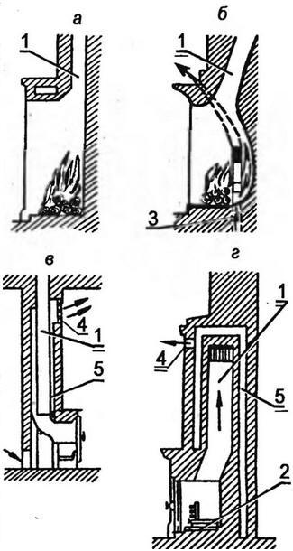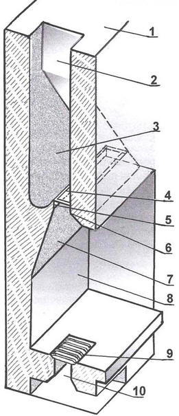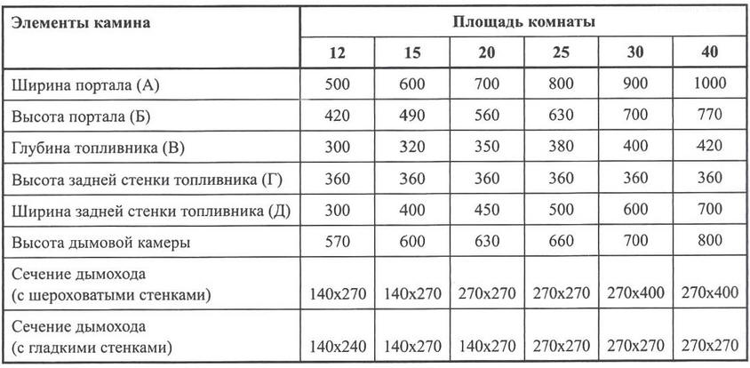 Еще в XVII веке был изготовлен камин со встроенным в топку калорифером, который представлял собой "коробку" с каналами для входа холодного воздуха и выхода нагретого. Дальнейшим шагом стало устройство дымооборотов, как в печах, что привело к появлению, в сущности, каминных печей. С той только разницей, что дымообороты обеспечивались благодаря металлическим трубам, встраиваемым в канал, в котором свободно циркулировал воздух: поднимаясь вдоль раскаленных от топки труб, он мгновенно нагревался и выходил в помещение через особое отверстие - душник. Такой же принцип использовался и в вариантах с кирпичными дымооборотами. Все это приближало закрытые (встроенные в капитальные стены) и полуоткрытые (пристроенные к стене) камины к конструкциям печей. Не случайно появился и своеобразный симбиоз, когда камин стали состыковывать с печью. И только третий вид каминов - открытые, отдельно стоящие в помещении свободно - сохранял исходную самостоятельность древнего очага. Они могут располагаться даже посредине комнаты, отличаясь эстетическими и декоративными выигрышными свойствами. Например, выполняться целиком из металла - медных, стальных листов, черненой жести. Соединение элементов осуществляется сваркой или на заклепках. Варианты форм и рисунок стыков обеспечивают таким каминам индивидуальную художественность. Особенно эффектно смотрятся подобные камины в виде подвешенных над топочной площадкой колпаков раструбов, с прикрепленными к потолку на проволочных растяжках дымоходами, с пирамидальными или конусными дымосборниками над горящими поленьями Общие элементы Какую конструкцию камина предпочесть - зависит не только от формы, но и от площади и объема помещения. Тем более что для большинства схем характерны общие функциональные элементы их устройства. Топливник (топочная ниша), как правило, своими размерами должен быть пропорционален самому помещению (рис. и табл.). От них будет зависеть и сила тяги камина, на которой скажется также и угол наклона стенок топливника, сечение и высота трубы. Будет ли камин дымить - зависит от того, насколько высота, ширина и глубина ниши соответствуют сечению и высоте дымовой трубы. Как правило, параметры топливника должны быть следующими: высота - от 3/5 до 4/5 его ширины, а глубина - половина или 2/3 высоты. Заднюю стенку топочной ниши примерно с трети ее высоты наклоняют внутрь на 20 - 22°, а вверху топливник сужают, чтобы образовалась горловина - все это способствует усилению тяги. Здесь устраивают выступ - газовый порог (дымовой зуб), чтобы избежать столкновения восходящего и нисходящего дымового потока, вызывающего дымление камина и вынос сажи в помещение. На этом же уровне (20 см от топочного отверстия) в горловине устанавливают заслонку (плоскую выдвигаемую или поворотную) - для регулирования тяги и "отключения" камина от дымовой трубы. Выше заслонки дымоход представляет собой сужающуюся пирамиду, верхняя часть которой переходит в дымовую трубу. Дымовая труба камина должна обеспечивать эффективное удаление образующихся в топливнике газов и дыма. Для создания нормальной тяги сечение дымохода не должно быть меньше 140x270 мм. Оптимальное поперечное сечение дымовой трубы - от 1/10 до 1/12 (а в более благоприятных случаях - 1/15) размеров топочного отверстия. В месте пересечения перекрытия труба имеет уширенную ч