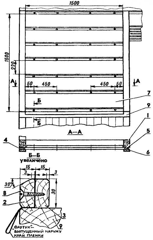 На рисунке 1 показан вариант такого "застекления" оконного проема 1500x1500 мм. Требуется семь наружных и шесть внутренних деревянных реек, пленка соответствующих размеров, 28 шурупов с антикоррозионным покрытием - по четыре шурупа для скрепления каждых из шести наружных и внутренних реек с пленкой между ними и для крепления верхней (неподвижной) рейки и края пленки к верхнему элементу проема.