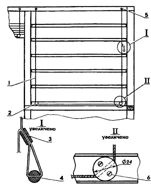 Рис. 2. Вид оконного проема изнутри (нажмите для увеличения): 1 - шнур; 2 - направляющая (древесина s15); 3- втулка-фиксатор, 4 - предохранитель (шарик); 5 - шуруп 4x16 (2 шт.); 6 - шуруп 3x25 (4 шт.).
