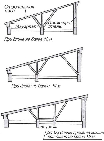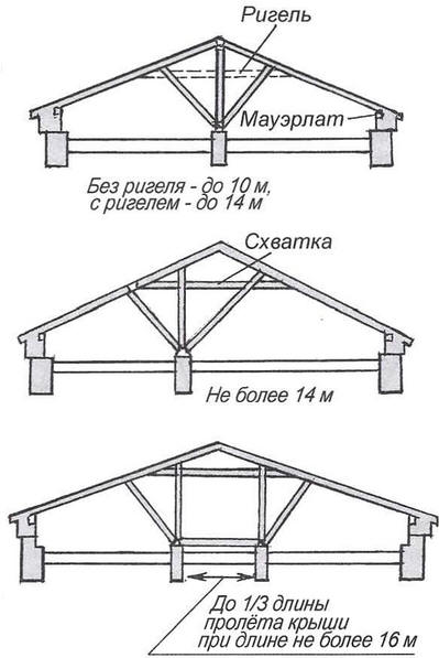 Если ширина пролета крыши менее 9 м, то применяют висячие стропила. В этом случае стропильные ноги опираются на наружную стену, а концы укрепляют брусом, так называемой затяжкой. Образуется жесткий треугольник. Можно дополнительно ввести в крепление верхний ригель. В последнее время строительная индустрия освоила производство готовых деревянных и металлических стропильных ферм, которые избавляют застройщика от сложной сборки. Причем основание ферм изготавливают из усиленного профиля, что позволяет делать чердачное перекрытие по этим элементам конструкции. После того как закончен монтаж стропил, строители устраивают деревянную обрешетку, состоящую из брусьев или досок, прибиваемых поперек стропильных ног. Степень их плотности зависит от того, какая кровля заложена в проекте. Чем она тяжелее (шифер, глиняная черепица), тем плотнее дощатый настил. Например, при шиферной кровле расстояние между досками или брусом обрешетки делают не более 490 мм, а при глиняной черепице - не более 330 мм. Линии стыковок элементов кровли обязательно должны лежать на доске обрешетки. В местах сопряжений скатов, карнизов и вдоль коньков обрешетку сооружают сплошной. Снизу под стропилами потолок обшивают обычно гипсокартонными листами, а внутрь закладывают необходимую гидро- и теплоизоляцию. Если чердак получился просторный, то его можно использовать под мансардный этаж или вспомогательные помещения. Строительные компании обычно включают услуги по сооружению крыши в полный объем возведения жилого дома.