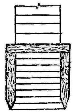 Дно колодца можно также образовать слоем гравия или щебня. Наращивание сруба сверху Даже для глубоких колодцев вырыть шахту полностью или хотя бы довести ее до глубины 7-8 м не просто. Операцию приходится разбивать на несколько этапов. Если грунт осыпается, стенки временно укрепляют досками, дно тщательно выравнивают. В шахту опускают первый венец, на него кладут второй, затем третий и так далее согласно меткам, пока сруб не поднимется на три-пять венцов над уровнем земли. При укладке венцов их припасовывают, ударяя по деревянной подкладке деревянным молотком-барсиком массой не менее 5 кг. Чтобы конструкция не расшаталась при перемещении, с внутренней стороны сруба по центру каждой из сторон прибивают толстые доски (с шагом в три венца). Подпирая поочередно одним или двумя чурбачками нижние венцы и подбивая клинья, под серединой каждой стенки выбирают грунт на глубину 20- 30 см. Затем подрывают грунт в углах. Выемку надо выполнять так, чтобы в центре образовалась ямка - сюда будет сползать выдавливаемый стенками грунт, потечет вода. Теперь поочередно вынимают клинья и подкладки - сруб плавно и равномерно опустится. Так ставят венцы на всю глубину колодца. По мере опускания сруба грунт поднимают со дна в ведре или бадьей. Для облегчения работы над шахтой помещают прочные стойки с перекладиной, на ней подвешивают блок, устраивают ворот или журавль; пользуясь ими, помощник поднимает землю. Работающий внизу при этом должен Для безопасности стать в один из углов с противоположной от груза стороны.