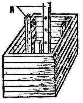 Квадратный торец с вертикальной стороны отесанных концов делят на восемь равных частей. Через точки деления проводят линии, параллельные отесанным сторонам, и метят полученные ребра буквами АБ, ВГ, ДЕ и ЖЗ. Сверху и внизу на ребре АБ откладывают по 2/8 части (по два деления), на ребре ВГ - по 1/8 части (по одному делению), на ребре ДЕ - по 3/8 (по три деления) и на ребре ЖЗ - по 2/8 (по два деления). Затем соединяют намеченные точки прямыми линиями и получают ребра лапы, равные по АБ - 4/8 части (четыре деления), по ВГ - 6/8 части (шесть делений), по ДЕ - 2/8 части (два деления) и по ЖЗ - 4/8 части (четыре деления). Если аккуратно срезать лишнюю древесину, получим лапу необходимой формы. Для разметки лучше всего сделать шаблон. Пазы размечают и выбирают как обычно. Во время прикидочной сборки венцы обязательно метят. Опустить сруб будет легче, если один или два нижних венца сделать немного шире принятых габаритов (использовав более толстые бревна или пластины) и усилить их режущими ножами из толстой листовой, полосовой или угловой стали. Это обеспечит срезание неровностей грунта на стенках шахты. Сруб должен опускаться строго вертикально. Для грунтов-плывунов сруб строят расширенным снизу - наподобие колокола или шатра Он легче входит в грунт, так как ссыпающаяся со стенок рыхлая порода не засорит шахту. Иногда перед посадкой сруба устраивают направляющие, чтобы при опускании он не перекосился. Для этого к стенкам шахты крепят с помощью длинных гвоздей толстые доски или стесанные жерди (так называемые салазки), а на землю укладывают раму из бревен, прижимают их к направляющим сруба и закрепляют кольями по углам. Неглубокие колодцы При залегании водоносного пласта на глубине не более 6 м и при не очень интенсивном притоке воды можно вырыть шахту сразу на всю глубину и, если требуется, временно укрепить ее стенки, чтобы грунт не обвалился. Дно шахты выравнивают, укладывают на него лежни (два бревна или бруска), а на них настилают пол из досок с зазорами для прохода воды. Затем, начиная с пола, укладывают венцы сруба. В этом случае допустимо использовать дуб.
