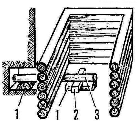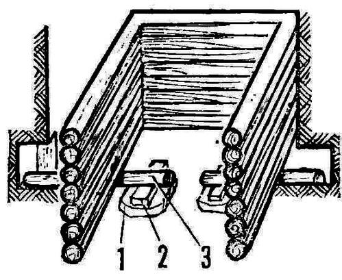 Если сруб заклинило, осадите его барсиком - несколько раз сильно ударьте по подкладке из толстой доски. Бывает, однако, что это не помогает. В таком случае берут четыре бревна, по три-четыре метра каждое. Кладут их на сруб крест-накрест и прочно закрепляют скобами. На бревна настилают толстые доски, прибивают их гвоздями, а сверху наваливают грунт, камни, кирпич, доводя массу до нескольких тонн. После осадки груз снимают и продолжают работу. Венец под венец Не часто, но случается, что наращивать сруб приходится снизу. Этот способ менее удобен, малопроизводителен и более трудоемок. И тем не менее им подчас приходится пользоваться. Чтобы подвести венцы снизу, подрывают грунт с одной стороны и в образовавшееся пространство вставляют приготовленное бревно. Его как можно плотнее прижимают к ранее установленному нижнему венцу с помощью подкладки и клиньев. С противоположной стороны точно так же укладывают второе, а затем два остальных. В той же последовательности, применяя подкладки и клинья, устанавливается весь сруб. Прочно засевшая в шахте конструкция может внезапно опуститься, поэтому несколько венцов делают из бревен длиннее номинальных на 60-70 см. Их устанавливают так. С противоположных сторон каждого бревна роют в грунте шахты продолговатые ямы - "заклады", или "печуры". Длина их должна быть не менее 40 см. В эти ниши вставляют выступающие концы, а под них подкладывают крупные камни или деревянные чурки с одной стесанной стороной. Между уплотнителем и концом вбивают клинья, пригоняя бревно к нижнему венцу. Укладку ведут поочередно с противоположных сторон. Выступающие концы - их называют пальцами - сыграют роль тормоза. В плотных грунтах "заклады" ставят через 2-3 м, а в слабых - через 3- б венцов. Необходимо напомнить и о том, что в плотном грунте сруб опускается ровно и достаточно быстро. Колодцы в плывунах Плывун - это очень мелкий песок, насыщенный водой. Рыть в нем колодцы без отлива (откачивания) воды практически невозможно. Приходится устраивать временные ограждающие стенки. Для этого берут толстые сосновые доски, обязательно шпунтованные; их концы с одной стороны заостряют. В грунт они забиваются с козелков деревянной колотушкой - бабой, работают вдвоем-втроем. Между стенками сруба и шахты должно оставаться пространство в 25- 30 см. Пройдя грунт на доступную глубину, устанавливают вертикально одну доску так, чтобы она могла скользить между крепежными стойками. Вторую доску приставляют к забитом, привязывают, чтобы не отходила, и тоже забивают. В такой последовательности образуют все стенки. Затем снова вынимают грунт, не забывая через каждые 1,5- 2 м ставить распорки между стенками. Углубляются до водоносного слоя и только после этого начинают сборку сруба. Венцы следует систематически осаживать барсиком и с внутренней стороны скреплять досками на гвоздях. Так же устраивают колодцы в рыхлых грунтах. Шпунтованные доски извлекают с помощью домкратов или рычагов. Оформление колодца Независимо от того, какой грунт выбирают из шахты, пространство между нею и стенками сруба надо заполнить сухой глиной, особенно последние 1,5 м до уровня земли. Глина укладывается и вокруг колодца в радиусе 1,5-2 м. Это гидрозамок: он необходим, чтобы защитить водоем от попадания надпочвенных вод. На тщательно утрамбованную глину можно уложить камень-плитн
