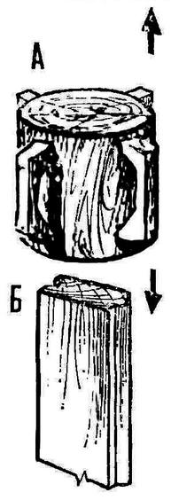 внутренними стенками легче ухаживать. Заготовки венцов из бревен необходимо отесать, с будущей внутренней стороны прострогать рубанком, а с внешней очистить от коры и убрать неровности - это облегчит спуск клети в шахту. Венцы должны плотно примыкать друг к другу, поэтому древесину применяют сухую: увлажняясь, она набухает и уплотняется. Между собой венцы соединяются прямоугольными или круглыми шипами - по два сверху и внизу. Способ соединения - "в угол", а чаще - "в лапу". Бревна или пластины при такой связке должны быть одинакового диаметоа или ширины, для этого их выравнивают. Концы бревен отесывают на длину одного-полутора диаметров на четыре канта, придавая торцам форму квадрата, одинакового для всех заготовок Это облегчит дальнейшие расчеты Из рисунка видно, что с торца лапа имеет в одну сторону шесть единиц, в другую - четыре. С внутренней стороны ее размеры уменьшены и равны четырем и двум единицам. Такая форма обеспечивает прочное угловое соединение
