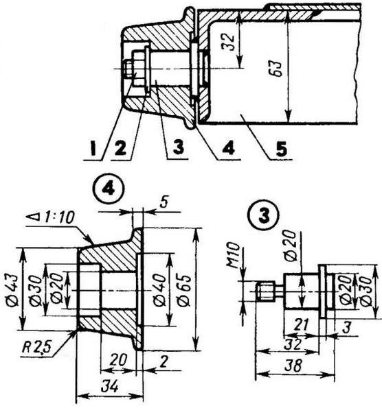 Установка ролика: 1 -гайка М10, 2 - шайба, 3 - ось, 4 - ролик, 5 - створка