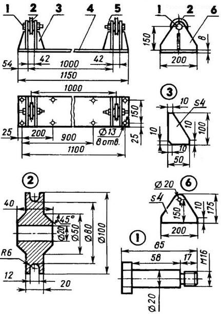Установка блоков: 1 - ось блока, 2 - блок. 3 - косынка, 4 - плита, 5 - гайка М16 с шайбой, 6 - стойка