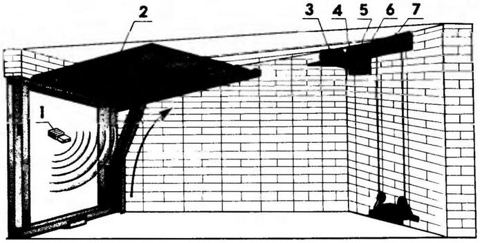 Вариант гаражных ворог с дистанционным управлением: 1 - передатчик, 2 - створка, 3 - электродвигатель, 4 - муфта соединительная, 5 - редуктор, 6 - муфта электромагнитная, 7 - барабан