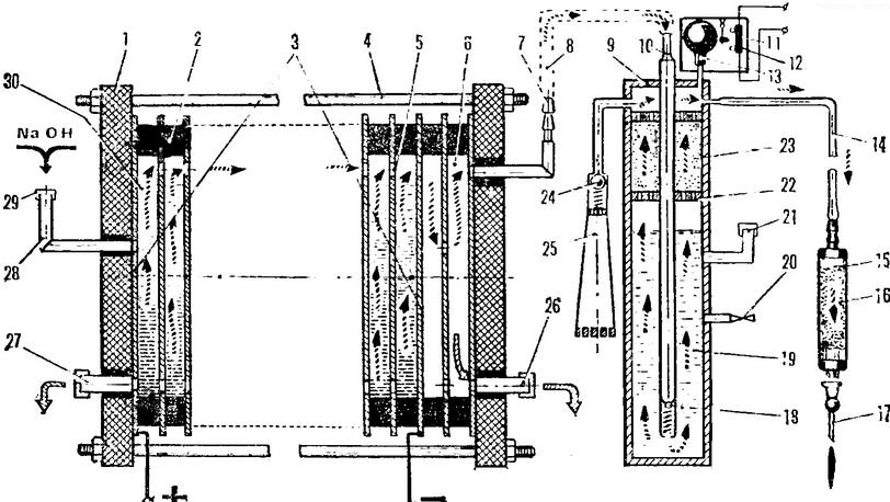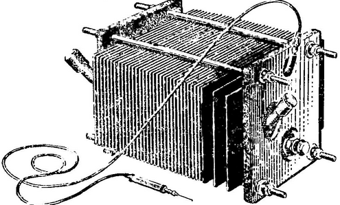 Выпрямитель подключается к электролизеру биполярно, как указано на схеме. Блок-схема выглядит так: Сеть 220 В > Выпрямитель > Электролизер > Водяной затвор > Горелка Расчет и изготовление В соответствии с законом Фарадея при электролизе количество выделенного вещества пропорционально силе тока. Теоретически каждые 2В,7 А дают 11,7 л водорода и 5,85 л кислорода. Практически выход по току никогда не бывает 100%. Падение напряжения на каждой паре электродов (расчетное) составляет 2 В. Плотность тока на 1 дм2 площади электрода зависит от времени непрерывной работы электролизера и составляет от 2 до 5 А. Простота конструкции позволила сократить количество основных деталей до трех: электрода, прокладки, платы. Электрод - листовое декапированное или трансформаторное железо 250х250 мм толщиной 0,3-0,5 мм (32 шт.). Прокладка - резина средней твердости (фланцевая), кольцо Ø 220 х Ø 250 мм, толщина - 4-6 мм (31 шт). Плата - любой изоляционный материал (листовой) 300х350 мм, толщина не менее 20 мм (2 шт.). Стяжные болты - М12 из стали 45, длина - по месту (не менее 4 шт.). Электролитом служит 22% раствор едкого натра (NаОН) в дистиллированной воде. По мере его расходования (общее количество 4 л) добавляется в электролизер только дистиллированная вода. Перед заливкой электролита нужно испытать герметичность собранного электролизера, заполнив его под давлением водой из городского водопровода; малейшие подтеки тщательно устраняются. При работе электролизера нельзя допустить нагревания электролита выше 65°. Ввиду постоянства состава газовой смеси, выдаваемой электролизером, упрощаются и требования к горелке. Ею может быть обыкновенная инъекционная игла от медицинского шприца, точнее, набор игл разного диаметра, от 0,3 до 1 мм. Игла крепится на конусе штуцера рукоятки так, как и на шприце. Рукоятка горелки представляет собой отрезок трубки, к которой через штуцер и шланг подводится газ от водяного затвора. Внутрь рукоятки помещается огнегасительная набивка в виде мелкой металлической дроби и сетки. В качестве шлангов используется хлорвиниловая трубка Ø 4-5 мм. Рекомендации по технике безопасности Следует помнить, что смесь водорода с кислородом, выдаваемая электролизером, - взрывоопасна! Однако сам прибор при тщательности его исполнения и аккуратности работы с ним никакой опасности не представляет. Это достигается тем, что отсутствуют промежуточные емкости значительного объема; газ нигде не накапливается: сколько его вырабатывается, столько же одновременно потребляется факелом. Однако категорически недопустимо заполнять получаемой газовой смесью какие-либо емкости для любых технологических целей, и тем более надувные детские летающие шары. Ни в коем случае нельзя также проверять герметичность соединений в конструкции электролизера пламенем свечи, спички и другим открытым огнем; недопустима и работа без заливки воды до верхнего контрольного уровня в водяном затворе или без систематической проверки наличия в нем воды, залитой перед началом работы. Опасно также снижение уровня электролита. Нужно постоянно добавлять дистиллированную воду по мере расхода электролита. При изготовлении электролита следует работать в защитных очках и резиновых перчатках. Гасить рабочий факел пламени нужно не выключением электропитания, а опусканием иглы в емкость с водой, иначе последует перегр