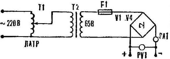Через заливную трубку полости заполняются электролитом; уровень его ограничивается верхним торцом трубки. Отверстие, находящееся в нижней части каждого электрода, служит для равномерного заполнения электролитом каждой полости. Нижний патрубок предназначен для опорожнения полостей. Обе трубки герметично закрываются. При электролизе образующаяся газовая смесь кислорода и водорода через отверстие, находящееся в верхней части каждого электрода, направляется в отстойник, разделенный на две части перегородкой. Из него смесь поступает в водяной затвор через штуцер и шланг, барботирует (проходит) через слой воды и по шлангу поступает в горелку. Не менее важная часть устройства - водяной затвор. Он служит для отделения подводящего и отводящего газ шлангов столбом воды высотой 120-150 мм, через который газ барботирует. Затвор надежно защищает электролизер от случайной вспышки газа в шланге горелки. Его корпус изготовлен из металлической трубы Ø 100 мм, заваренной с обоих концов. Через патрубок заливается вода до верхнего контрольного уровня. Кран находится на нижнем продольном уровне. Решетка служит опорой фильтра, изготовленного из любого гранулированного негорючего материала. Фильтр предотвращает унос влаги газом. Газоприемная трубка заканчивается обратным клапаном обычной конструкции. В корпус вмонтирован также обратный клапан с раструбом, срабатывающий при случайной вспышке газа. Автоматический выключатель напряжения - самодельный. Он состоит из корпуса, контактора и резиновой груши. Полость последней соединена с полостью водяного затвора. При превышении давления в системе груша раздувается и нажимом на рычаг контактора отключает прибор от электросети. Электросхема выпрямителя состоит из следующих элементов: лабораторный автотрансформатор - ЛАТР 2 кВт, трансформатор понижающий 220/65 В, мост на диодах на 15 А (любой конструкции), плавкий предохранитель на 20 А, амперметр (шкала не менее 15 А), вольтметр.