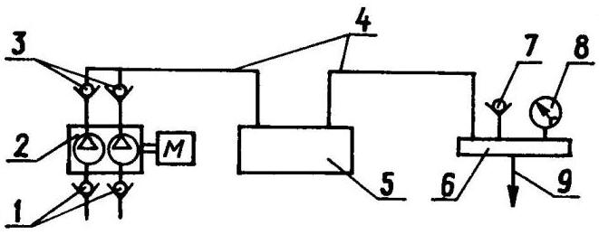Пневматическая схема компрессорной установки: 1 - впускные клапаны; 2 - двухцилиндровый компрессор с приводом от электродвигателя; 3 - выпускные клапаны; 4 - трубки; 5 - ресивер; 6 - раздаточная коробка; 7 - предохранительный клапан; 8 - манометр; 9 - патрубок выпуска сжатого воздуха