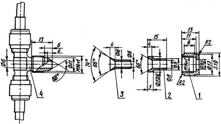Узел соединения трубки и фитинга (нажмите для увеличения): 1 - накидная гайка М14х1; 2 - втулка; 3 - трубопровод (алюминиевая трубка 8x1); 4 - фитинг М14х1 (тройник)
