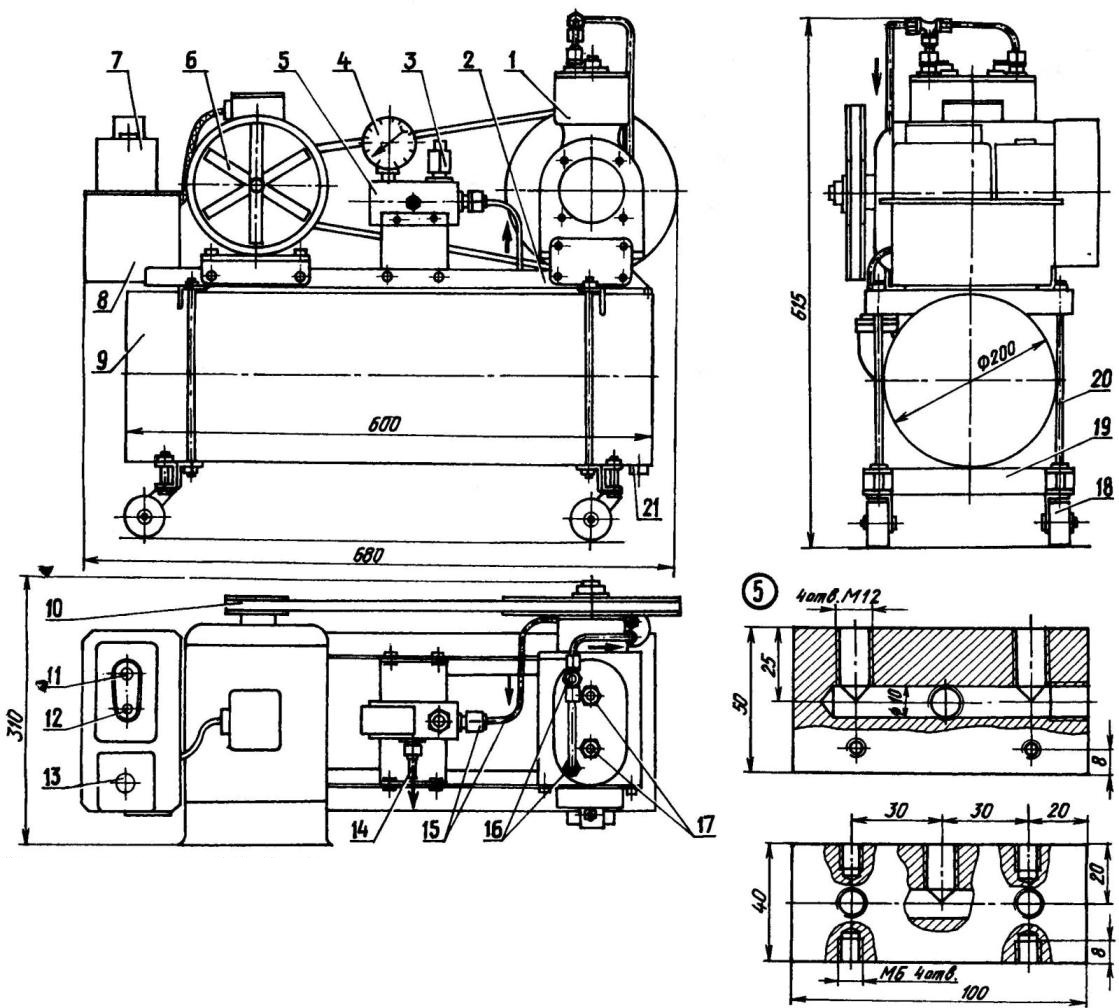 Компрессорная установка (общий вид) (нажмите для увеличения): 1 - компрессор (от автомобиля ЗИЛ-130); 2 - рама (уголок 35x35); 3 - предохранительный клапан; 4 - манометр; 5 - раздаточная коробка; 6 - электродвигатель (трехфазный, N = 1 кВт); 7 - пусковая коробка (от стиральной машины "Кама"); 8 - батарея конденсаторов; 9 - промежуточный ресивер (кислородный баллон); 10 - клиноременная передача; 11 -кнопка "стоп"; 12 - кнопка пуска двигателя; 13 - кнопка кратковременного подключения пусковой батареи конденсатора; 14 - штуцер выпускного (расходного) патрубка; 15 - трубопроводы 10x2 с фитингами; 16 - выпускные клапаны; 17 - впускные клапаны; 18 - самоориентирующееся резиновое колесо (4 шт.); 19 - поперечина (уголок 35x35,2 шт.); 20 - стяжная шпилька М10 (4 шт.); 21 - пробка сливного отверстия