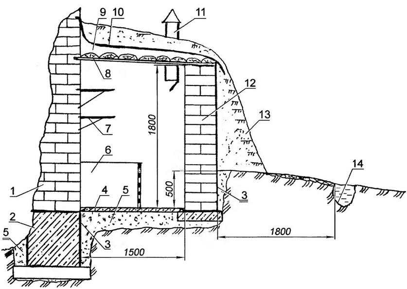 Нельзя также применять материал, бывший в употреблении (от разборки старых домов, даже кажущихся на вид довольно крепкими), так как эта древесина обычно заражена спорами грибков. По этой же причине не следует пускать в дело лесоматериал, долгое время (три года и более) пролежавший под открытым небом, а также сухостой, который обычно бывает ослаблен жуками-древоточцами и менее прочен во влажной среде. В любом случае рекомендую древесину, выбранную для строительства погреба, обработать раствором антисептика. К сооружению погреба лучше всего приступать в середине лета, когда уровень грунтовых вод самый низкий. Конечно же, перед началом работы необходимо заготовить весь необходимый строительный материал, чтобы впоследствии не допускать перерывов в работе. На выбранном месте надо будет снять растительный слой, а потом сделать земляную выемку на 500 мм и более (глубина зависит от уровня стояния грунтовых вод). Выемка улучшит обогрев погреба почвенным теплом. Выбранный грунт может быть использован для наружной обваловки погреба Дальнейшая технология во многом традиционна. Основание земляной выемки трамбуют и на 70 - 100 мм засыпают (с последующим уплотнением) крупнозернистым песком, мелким гравием, просеянным кирпичным щебнем, керамзитом и т. д. Такая подбивка надежно защитит погреб от сырости. По дренирующему материалу укладывают мини-фундамент, на котором аккуратно возводят (не забывая о гидроизоляции!) три стенки из красного кирпича. Обваловка - сухой землей или торфом с посевом травы Вокруг погреба на расстоянии 1 - 1,8 м устраивают водоотводную канавку. Высота погреба до перекрытия - 1,8 м. Внутри с одной стороны от прохода размещают решетчатые закрома, приподнятые на 100 мм над полом, с другой (на расстоянии 500 - 600 мм по высоте) - полки. Закрома делают высотой около 1 м с решетчатым полом для вентиляции. Во избежание промерзания погреба на случай сильных морозов перекрытие дополнительно утепляют. Вокруг погреба устраивают водоотводную канавку глубиной порядка 300 мм, которую можно даже заполнить дренирующим материалом: камнем, кирпичным боем, щебнем или хворостом из очищенных от коры веток. Весь погреб обваловывают землей и засеивают травой или обкладывают дерном. Это способствует сохранению постоянной температуры внутри погреба. Более того, сам холм погреба зачастую используют для посадки декоративных растений. Как писал выдающийся русский ученый и агроном Андрей Тимофеевич Болотов (1738-1833 гг.), добротный погреб "потребен к тому сухой и довольно просторный, дабы в нем не было душно, но прохладного ветра (сквозняка) не должно быть, ибо он овощи высушивает. Если же он, напротив, глух (с застойным, непроветриваемым воздухом) и сыр, то овощи сгнивают". Конечно же, для поддержания нормального температурно-влажностного режима в погребе должна быть достаточно хорошая приточно-вытяжная вентиляция. При этом хорошо устанавливать две трубы - вытяжную и приточную, которые для лучшего воздухообмена располагают в двух уровнях и, по возможности, в разных местах, чтобы избежать подсасывания свежего воздуха. Вытяжную трубу размещают вверху, под самым потолком, а приточную - внизу и на высоте 500-600 мм от пола. Перемещение воздуха по ним происходит за счет разности удельного веса холодного наружного и теплого внутреннего воздуха, поэтому такая система в