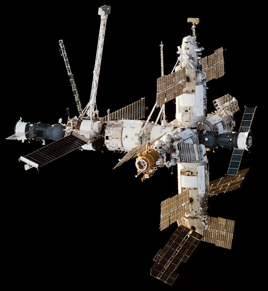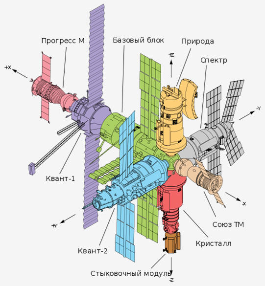 Базовый блок по размерам и внешнему виду подобен российским орбитальным станциям серии "Салют". Его основу составляет герметичный рабочий отсек. Здесь расположены центральный пост управления и средства связи. Позаботились конструкторы и о комфортных условиях для экипажа: на станции были две индивидуальные каюты и общая кают-компания с рабочим столом, устройствами для подогрева воды и пищи, беговая дорожка и велоэргометр. На наружной поверхности рабочего отсека размещались две поворотные панели солнечных батарей и неподвижная третья, смонтированная космонавтами в ходе полета. Перед рабочим отсеком - герметичный переходный отсек, который мог служить шлюзом для выхода в открытый космос. Там пять стыковочных портов для соединения с транспортными кораблями и научными модулями. За рабочим отсеком располагался негерметичный агрегатный отсек с герметичной переходной камерой со стыковочным узлом, к которому впоследствии был подсоединен модуль "Квант". Снаружи агрегатного отсека на поворотной штанге установили остронаправленную антенну, обеспечивающую связь через спутник-ретранслятор, который находился на геостационарной орбите. Подобная орбита означает, что спутник висит над одной точкой земной поверхности. В апреле 1987 года к базовому блоку был пристыкован модуль "Квант". Он представляет собой единый герметический отсек с двумя люками, один из которых служил рабочим портом для приема транспортных кораблей "Прогресс-М". Вокруг него располагался комплекс астрофизических приборов, предназначенных преимущественно для исследования недоступных наблюдениям с Земли рентгеновских звезд. На наружной поверхности космонавтами были смонтированы два узла крепления поворотных многоразовых солнечных батареи. Элементы конструкции международной станции - две крупногабаритные фермы "Рапана" и "Софора". На "Мире" они проходили многолетние испытания на прочность и долговечность в условиях космоса. На конце "Софоры" размещалась выносная двигательная установка крена. "Квант-2" был пристыкован в декабре 1989 года. Другое название блока - модуль дооснащения, поскольку в нем было расположено оборудование, необходимое для работы систем жизнеобеспечения станции и создания дополнительного комфорта для ее обитателей. В частности, шлюзовой отсек использовался как хранилище скафандров и в качестве ангара для автономного средства перемещения космонавта. В модуле "Кристалл" (был пристыкован в 1990 году) размещалось преимущественно научное и технологическое оборудование для исследования технологии получения новых материалов в условиях невесомости. К нему через переходной узел присоединялся стыковочный отсек. Аппаратура модуля "Спектр" (1995) позволяла вести постоянные наблюдения за состоянием атмосферы, океана и земной поверхности, а также проводить медико-биологические исследования и т д. "Спектр" был оснащен четырьмя поворотными солнечными батареями, дающими электроэнергию для питания научной аппаратуры. Стыковочный отсек (1995) - это сравнительно небольшой модуль, созданный специально для американского космического корабля "Атлантис". Он был доставлен на "Мир" американским многоразовым пилотируемым транспортным космическим кораблем "Спейс Шаттл". В блоке "Природа" (1996) располагались высокоточные приборы для наблюдения за земной поверхно