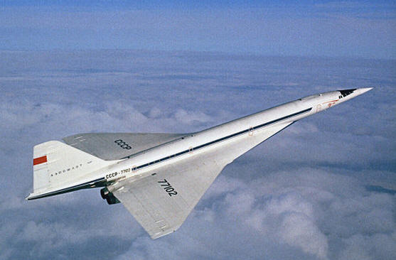 Логическим завершением этого большого комплекса работ был переход к треугольному крылу с непрерывно меняющимся по размаху углом стреловидности: от очень большого у корня (75-85 градусов) до средних значений в концевой части (50-65 градусов). Такие крылья получили название "оживальных" и были применены совместной англо-французской фирмой при создании сверхзвуковых самолетов гражданской авиации "Конкорд". Прежде чем применить оживальные крылья на реальном самолете, было решено, независимо друг от друга, и в Англии, и в СССР провести испытания не только в аэродинамических трубах, но и в полете на самолетах-аналогах. Такой летающей моделью в СССР стал одноместный экспериментальный самолет ОКБ А.И. Микояна "МиГ-Аналог 144", а в Англии - одноместный экспериментальный самолет BAC221 фирмы "Бритиш Эркрафт". Летчик-испытатель О.В. Гудков начиная с 1967 года совершил десятки полетов на "Аналоге 144", неоднократно проверив все возможные режимы, включая даже те, которые были недоступны пассажирскому самолету. Результаты испытаний этой летающей лаборатории были использованы для доработки проекта Ту-144 и позволили ускорить его испытания, начатые в декабре 1968 года летчиком-испытателем Э.В. Еляном. Первый полет Ту-144 состоялся 31 декабря 1968 года и длился 38 минут. На другой день французская газета "Пари пресс энтрансижан" писала: "Полет Ту-144 является исторической датой в авиации, знаменующей выход Советского Союза на первое место в строительстве сверхзвуковых пассажирских самолетов". Другой английский самолет-аналог BAC221 начал свои полеты с мая 1964 года. У него был более узкий диапазон исследуемых скоростей - от посадочных до 1700 километров в час. Но, несмотря на более легкую задачу, испытания затянулись. Результаты их были использованы при постройке самолета "Конкорд", который поднялся в воздух на три месяца позже Ту-144 - в марте 1969 года. Достижения науки в СССР и в передовых странах Запада позволили советским ученым и конструкторам, а также конструкторам англо-французских компаний найти оптимальное решение аэродинамической и общей компоновки сверхзвукового самолета гражданской авиации. В опытном варианте Ту-144 при взлетной массе 195 тонн и грузоподъемности 15 тонн при крейсерской скорости 2200 километров в час имел расчетную дальность 6500 километров. На практическом потолке, равном 18000 метров, он мог развивать максимальную скорость 2500 километров в час. Самолет Ту-144 был снабжен более экономичными, чем у "Конкорда", турбореактивными двигателями с форсажной камерой ОКБ Н.Д. Кузнецова - НК-144 с тягой 12750 кН каждый. После первого полета Ту-144 31 декабря 1968 года второй полет продолжительностью 50 минут был совершен 8 января 1969 года. В процессе дальнейших испытаний в мае 1970 года впервые в истории авиации гражданский пассажирский самолет достиг числа М равного двум - скорости 2150 километров в час на высоте 16300 метров. Осенью того же года на высоте 17000 метров была превышена скорость 2430 километров в час. Это и сегодня рекорд скорости для пассажирских самолетов. Однако судьба лайнера оказалась печальной. Сначала произошла катастрофа на выставке в Ле-Бурже, что существенно затормозило выход Ту-144 на регулярные авиалинии. Первый коммерческий сверхзвуковой рейс, но без пассажиров на борту, самолет Ту-144 совершил 26 декабря 1975 года по маршруту Москва - Алма-Ата, но лишь с ноября 1977 года