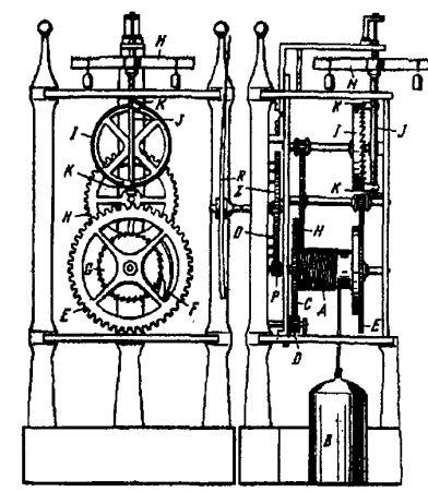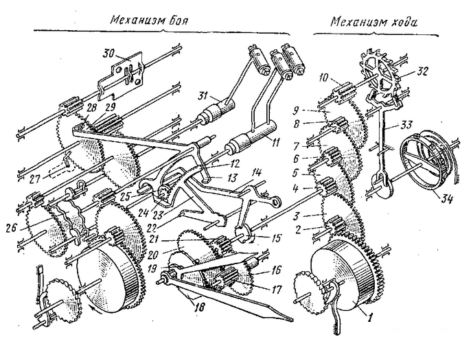 Первые упоминания о башенных колесных часах в Европе приходятся на границу XIII и XIV веков. Могли ли такие часы появиться раньше? Чтобы ответить на этот вопрос, посмотрим, из каких основных компонентов состоит часовой механизм. Таких главных узлов можно выделить шесть: 1) двигатель; 2) передаточный механизм из зубчатых колес; 3) регулятор, создающий равномерное движение; 4) распределитель, или спуск; 5) стрелочный механизм и 6) механизм перевода и заводки часов.