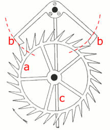 Первые часовые механизмы приводились в движение энергией опускающегося груза. Приводной механизм состоял из гладкого деревянного вала и намотанного на него пенькового каната с каменной, а позднее металлической гирей на конце. Благодаря силе тяжести гири, канат начинал разматываться и вращал вал. На вал было насажено большое или главное зубчатое колесо, находившееся в сцеплении с зубчатыми колесами передаточного механизма. Таким образом, вращение от вала передавалось механизму часов. Уже прежде мы упоминали, что период вращения колес в зубчатой передаче зависит от отношения диаметров входящих в нее колес (или, что то же самое, отношения числа зубьев). Подбирая колеса с разным количеством зубьев, несложно добиться, например, чтобы одно из них совершало оборот ровно за 12 часов. Если насадить на вал этого колеса стрелку, то она будет совершать полный оборот за то же время. Понятно, что так же можно подобрать колеса, делающие полный оборот за минуту или за час; с ними можно соединить секундную и минутные стрелки. Но такие часы появились значительно позже - только в XVIII веке, а до этого использовалась единственная часовая стрелка. Назначение передаточного механизма в таких часах состояло в том, чтобы передать и преобразовать соответствующим образом движение от главного зубчатого колеса к часовому колесу. Однако, чтобы часы могли служить для измерения времени, стрелка должна совершать свои обороты с одной и той же периодичностью. Между тем груз, как это всем хорошо известно, движется под действием сил притяжения с ускорением. Если бы гиря опускалась свободно, то вал вращался бы ускоренно, соответственно стрелка делала бы каждый следующий оборот за более короткое время, чем предыдущий. Столкнувшись с этой проблемой, средневековые механики (хотя они и не имели понятия об ускорении) сообразили, что ход часов не может зависеть только от движения груза. Механизм необходимо было дополнить еще одним устройством. Это устройство должно было обладать собственным, независимым "чувством времени" и в соответствии с этим управлять движением всего механизма. Так родилась идея регулятора. Если современного человека спросить, какое простейшее приспособление целесообразнее всего использовать в качестве регулятора, он, скорее всего, назовет маятник. Действительно, маятник лучше всего удовлетворяет поставленным условиям. В этом можно убедиться, сделав простой опыт. Если шарик, привязанный к достаточно длинной нити, отклонить на небольшой угол и отпустить, он начнет колебаться. Вооружившись секундомером, можно посчитать, сколько колебаний совершит маятник, к примеру, за каждые пятнадцать секунд. Продолжая наблюдения в течение полутора-двух минут, легко заметить, что все измерения совпадают. Из-за трения о воздух размах колебаний шарика будет постепенно уменьшаться, но (и это очень важно!) длительность колебания будет при этом оставаться неизменной. Другими словами, маятник обладает прекрасным "чувством времени". Однако очень долго эти замечательные свойства маятника были неизвестны механикам, и маятниковые часы появились только во второй половине XVII века. В первых механических часах регулятором служило коромысло (билянец). Коромысло с древних времен применялось в таком широко распространенном устройстве, как весы. Если на каждое плечо так