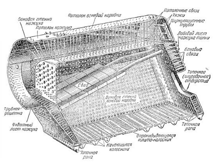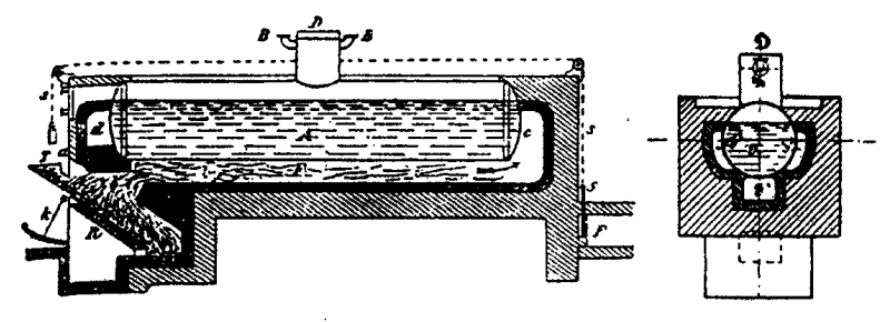 На ранних паровозах использовался простой цилиндрический котел. Здесь D - колпак, куда собирается пар, проводимый к паровым клапанам по одной из трубок B (другая соединялась с предохранительным клапаном). Котел имел наклонную решетку R, через которую атмосферный воздух доставлялся к углю, насыпаемому через воронку T. Уголь скользил по воронке вниз по мере сгорания, причем самое сильное горение происходило внизу решетки; пламя оттуда поднималось под наклонным сводом G, где имелось отверстие b, через которое горячие газы поступали в первый дымоход F под котлом. Затем эти газы попадали в c и в боковой дымоход F, а через соединение d на передней стороне проходили по F снова в заднюю часть котла, откуда уже вылетали в дымовую трубу. Таким образом, котел как бы со всех сторон обтекался горячим воздухом. Зольная дверца K и задвижка S были простыми приспособлениями, с помощью которых кочегар регулировал доступ воздуха в топку.