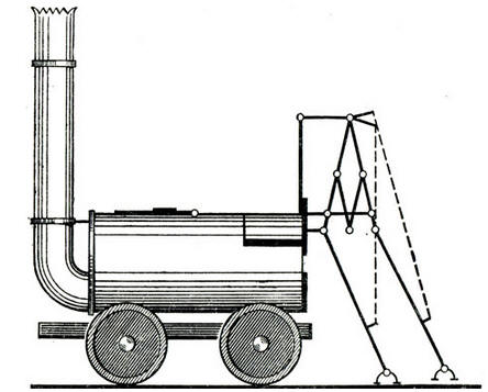 У Тривайтика возникла идея поставить паровой автомобиль на рельсы. В 1804 году он создал свой первый паровоз. Этот паровоз представлял собой цилиндрический паровой котел, покоившийся на двух осях. Топка располагалась впереди под дымовой трубой, так что тендер (повозку с углем, где сидел кочегар) приходилось прицеплять впереди паровоза. Длинный горизонтальный цилиндр 210 мм в диаметре имел ход поршня в 1, 4 м. Шток поршня далеко выдавался впереди паровоза и поддерживался особым кронштейном. С одной стороны паровоза имелась сложная зубчато-колесная передача на обе оси, с другой - большое маховое колесо, как у фабричной паровой машины. По многим показателям этот первый в истории паровоз имел удивительные характеристики. Так, при собственном весе в 5 т он транспортировал со скоростью 8 км/ч пять вагонов общим весом 25 т. Порожняком он двигался со скоростью 26 км/ч.