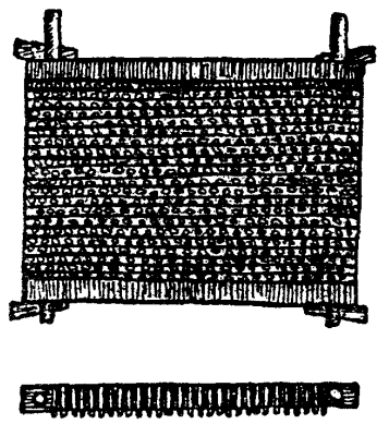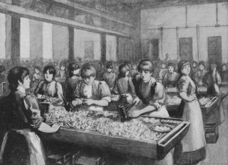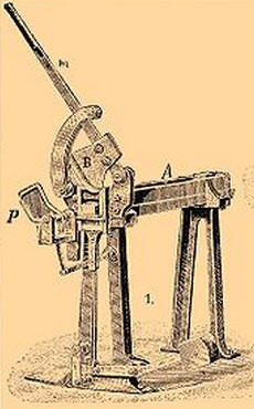 Лучинки укладывались в корыто и подвигались вплотную к регулирующей пластинке, а затем с помощью рычага и ножа отрезали установленную длину. Вместо ручного строгания очень скоро стала применяться специальная машина. Дерево здесь упиралось в конец станины и обрабатывалось при помощи режущего устройства, в котором имелось несколько заостренных трубочек, вырезающих лучинки при движении режущего устройства. Для того чтобы подвергнуться обработке на этой машине, бревно сначала разрезалось на доски. Машина эта, впрочем, имела много недостатков и давала большой отход. Поэтому в дальнейшем ее заменили другие, а сам процесс резки лучинок был разбит на несколько операций. Для дальнейшей обработки соломку необходимо было уложить ровными и параллельными рядами. Для этой цели тоже употребляли специальную машину. На платформу, которая получала быстрые сотрясательные движения, устанавливали перегороженный ящик, причем расстояние между перегородками соответствовало длине спички. При быстром движении ящика соломки укладывались между перегородками в отделения ящика, а мусор проваливался через его нижние отверстия. Затем ящик снимали и переворачивали. Соломка оставалась на доске параллельными рядами и в таком виде направлялась в макальную. Перед обмакиванием соломку укладывали в специальную рамку, состоявшую из основания и двух крепившихся к нему железных стержней, на которые надевались деревянные дощечки. Поперек дощечек проходили желобки, расположенные параллельно друг другу. Длина этих желобков делалась такой, чтобы положенная в них соломка выступала приблизительно на четверть своей длины. Заполненные дощечки надевались на стержни одна над другой. Сверху все они прикрывались доской и зажимались клиньями. Таким образом получалась рамка, в которой помещалось около 2500 спичек. В дальнейшем эта операция была механизирована и выполнялась специальной наборной машиной. Каждую спичку необходимо было обмакивать дважды - сначала в серу или парафин, а потом в зажигательную массу. Изготовление зажигательной массы было сложным делом, требовавшим больших предосторожностей. Особое значение имело ее тщательное перемешивание. Для этого каждая составная часть сильно измельчалась до порошкообразного состояния. Первоначально обмакивание спичек происходило вручную с помощью макальной сковороды. Макальная сковорода состояла из двух частей: плоской и углубленной. Первая делалась несколько больше наборной рамы и служила собственно для обмакивания в расплавленную массу. Слой ее здесь был незначителен и соответствовал вышине парафинированной (или серненой) части спички. Вторая часть служила резервуаром для массы и способствовала сохранению постоянного уровня.