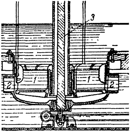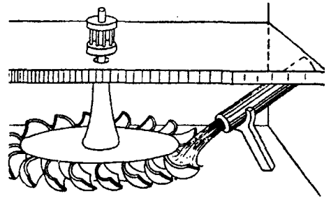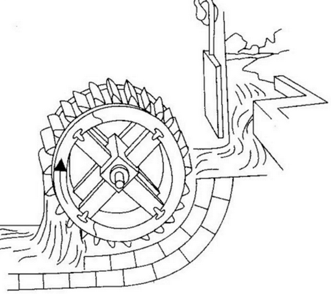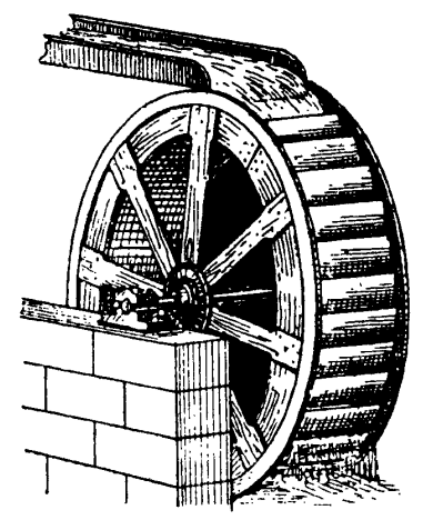 Устройство наливного колеса также было очень просто. По ободу большого колеса или барабана приделывался ряд ковшей. Вода сверху из желоба наливалась в верхний ковш. Наполненный водой ковш становился тяжелее, опускался вниз и тянул за собой весь обод. Колесо начинало вращаться. На место опускающегося колеса становился следующий ковш. Он тоже наполнялся непрерывно текущей водой и начинал опускаться. На его место приходил третий, потом четвертый и так далее. Когда ковши доходили до нижней точки обода, вода из них выливалась. При прочих равных условиях мощность верхнебойных колес была выше, чем у нижнебойных, но зато эти колеса имели большие габариты и невысокую скорость вращения. Кроме того, для их эффективной работы требовалось создавать значительный перепад воды, то есть строить каналы, плотины и прочие дорогостоящие сооружения.